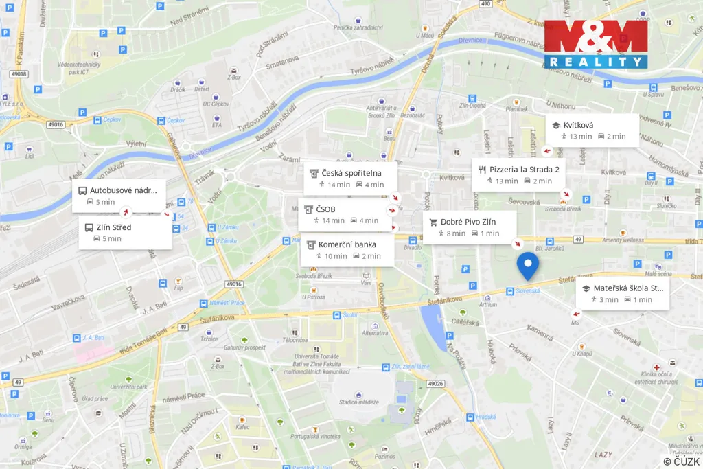 K pronájmu nabízíme byt 2+1 o velikosti 54 m², který se nachází téměř v centru města Zlín, na ulici Štefánikova. Byt je situován ve 3. patře bytového domu bez výtahu a je orientován jižním směrem. Dispozici tvoří samostatná kuchyň, obývací pokoj, ložnice a koupelna s vanou a toaletou. Kuchyň je vybavena plynovým sporákem, lednicí, myčkou a pračkou. K bytu náleží sklepní kóje o velikosti 6 m² a možnost využívat společnou kolárnu. Zastávka MHD je ve vzdálenosti asi 80 m. I přes svou polohu v rušné lokalitě se jedná o tichý byt s veškerou občanskou vybaveností na dosah.