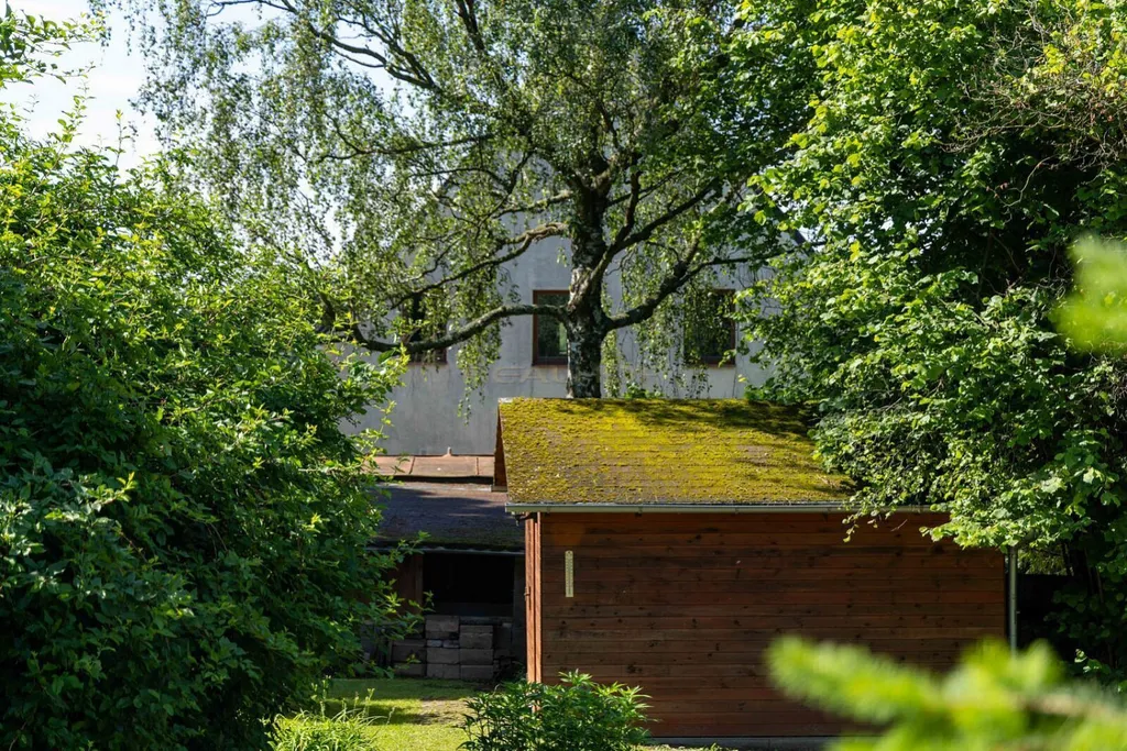 Samostatná garáž s vraty na dálkové ovládání, dřevník a zahradní domek.