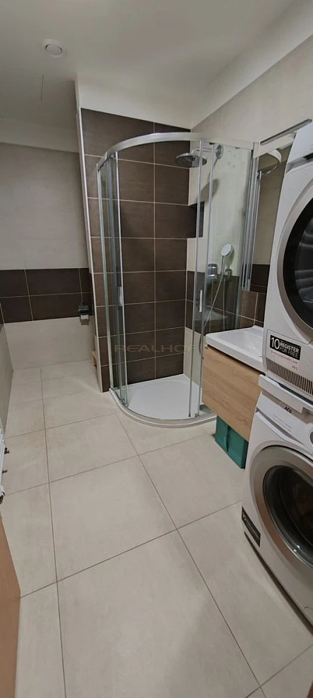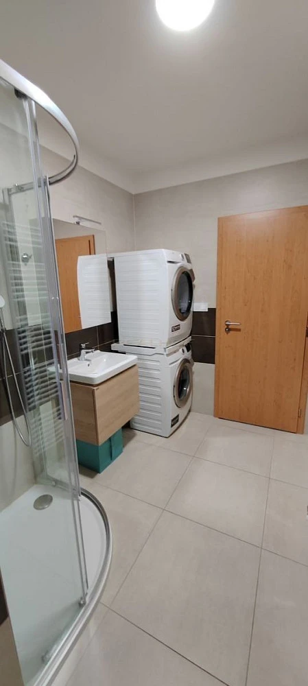 Vybavení bytu: kožená sedačka, konferenční stolek, barový pult se židlemi, nádobí. V koupelně je pračka a sušička AEG.