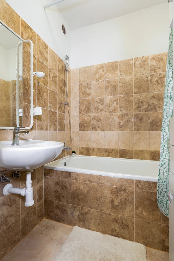 Útulnost bytu dotváří v hnědých tónech laděná koupelna s vanou, umyvadlovou skříňkou a ve stejných tónech řešená samostatná toaleta.
