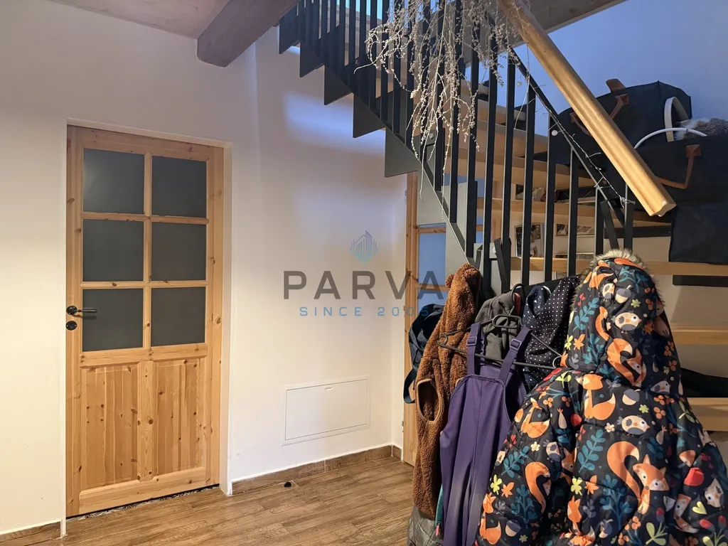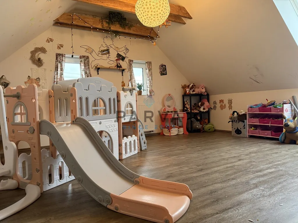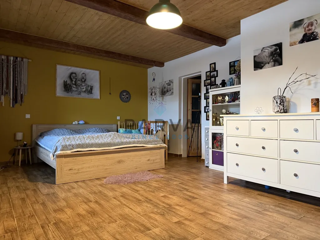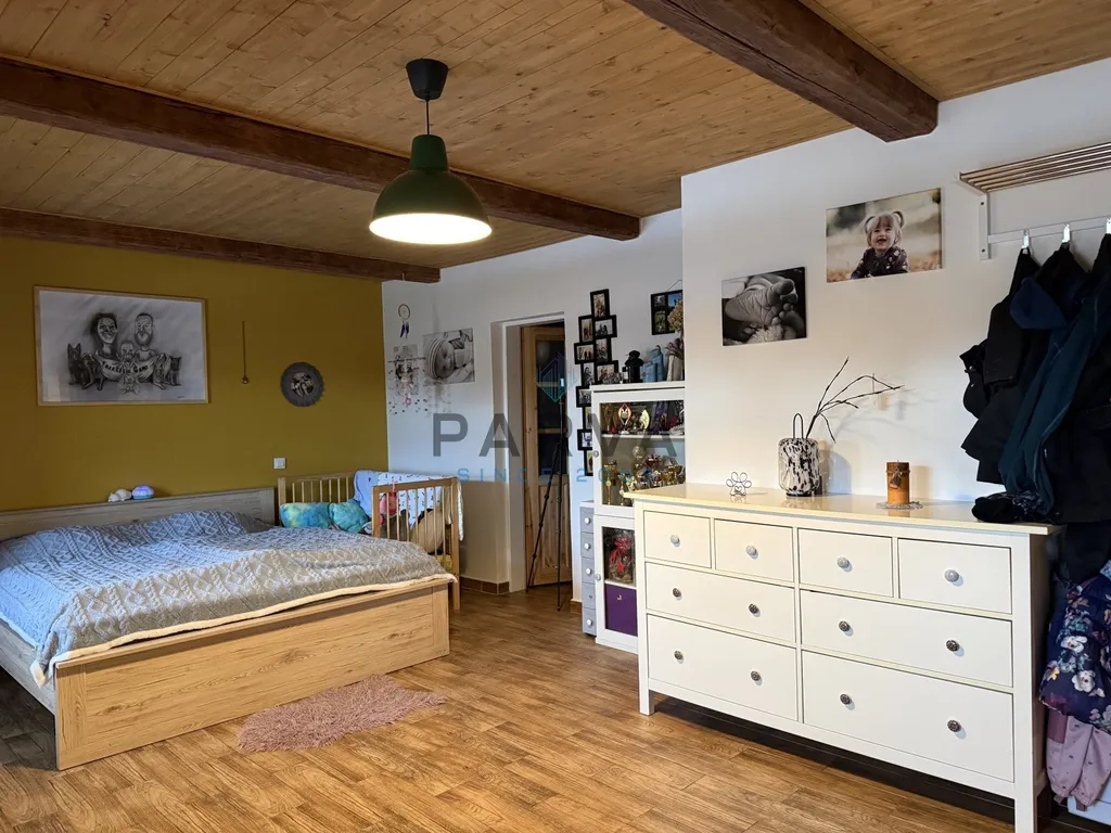 Po dřevěných schodech z chodby se dostaneme do podkroví - galerie - kde je pracovní kout . Dva podkrovní pokoje s přiznanými trámy a střešními okny. Sociální zařízení - umyvadlo a WC. Střecha je sedlová a zateplená - tašky beton Bramac . Komín se nepoužívá ale je nově vyvložkován.