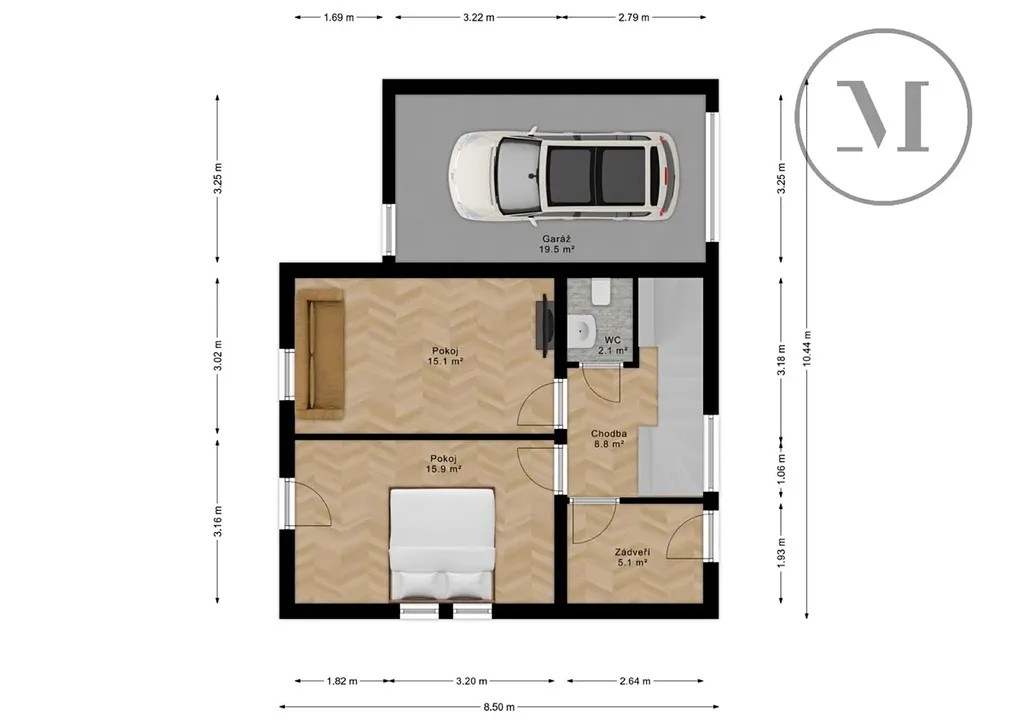 Dispozice 1. nadzemního podlaží zahrnuje vstupní halu se schodištěm, samostatné WC, koupelnu, prostorný obývací pokoj s kuchyňským koutem (31,66 m²) a přímým vstupem na terasu o velikosti 11,5 m². Součástí je také garáž (18,36 m²) a sklad. Ve 2. podlaží se nacházejí dva samostatné pokoje, další WC, hala se schodištěm a balkon o velikosti 6,34 m².