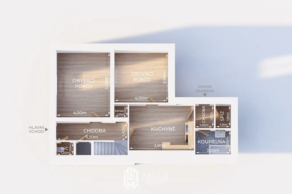 kuchyni, druhou chodbu se schodištěm, samostatné WC, šatnu a dva neprůchozí pokoje. 2. nadzemní podlaží nabízí obdobnou dispozici 2+1, tvoří jej chodba se
