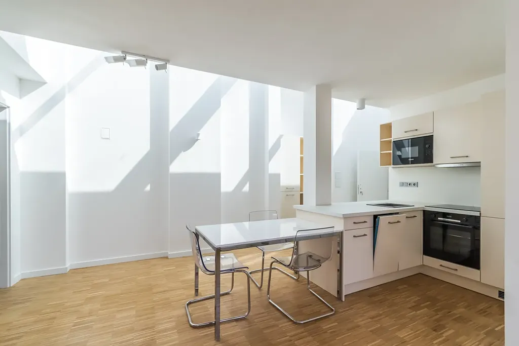 Byt disponuje také kompletně vybavenou kuchyní na míru, spotřebiči značky BOSCH: včetně lednice s mrazákem, troubou s parní funkcí, mikrovlnkou, myčkou a indukční varnou deskou. V koupelně pak najdete novou pračku.