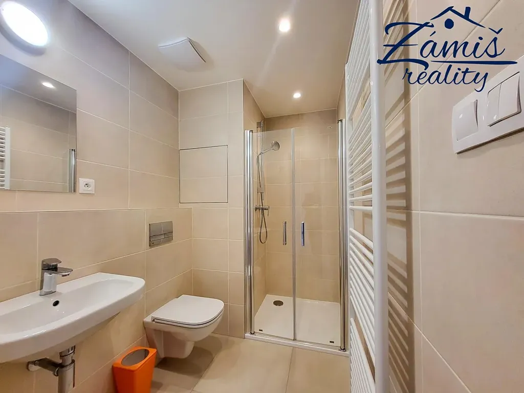 V koupelně je umístěn skleněný sprchový kout, umyvadlo se zrcadlem a WC.