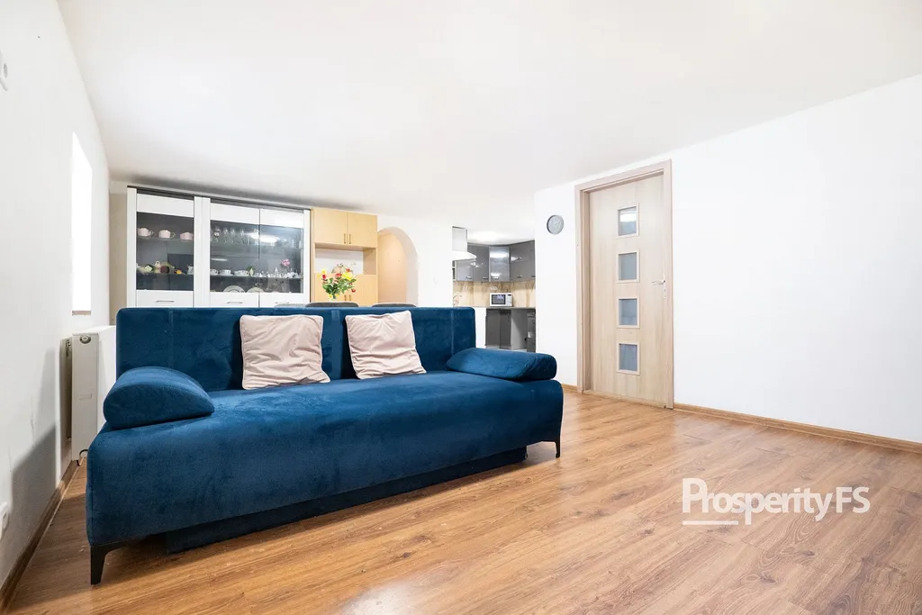Druhá bytová jednotka je řešena modernějším způsobem – s obývacím prostorem propojeným s kuchyňským koutem, což působí vzdušně a útulně. K tomu dva samostatné pokoje, které mohou sloužit jako ložnice, dětský pokoj či pracovna. Díky své dispozici je tento byt vhodný nejen pro prarodiče, ale také pro mladý pár nebo jako investiční pronájem.