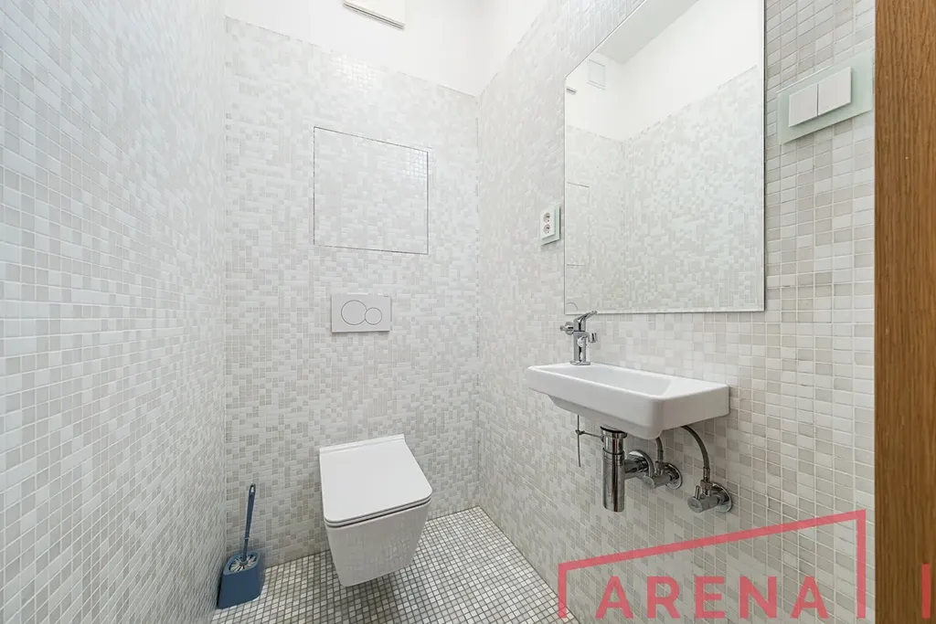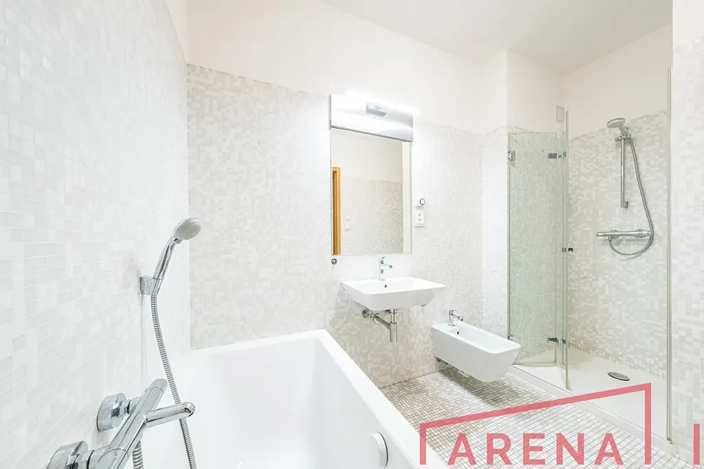 Koupelna je vybavena vanou, sprchovým koutem, umyvadlem a otopným žebříkem, toaleta je samostatná. Byt je klimatizován a vytápění je řešeno centrální plynovou kotelnou v domě.
