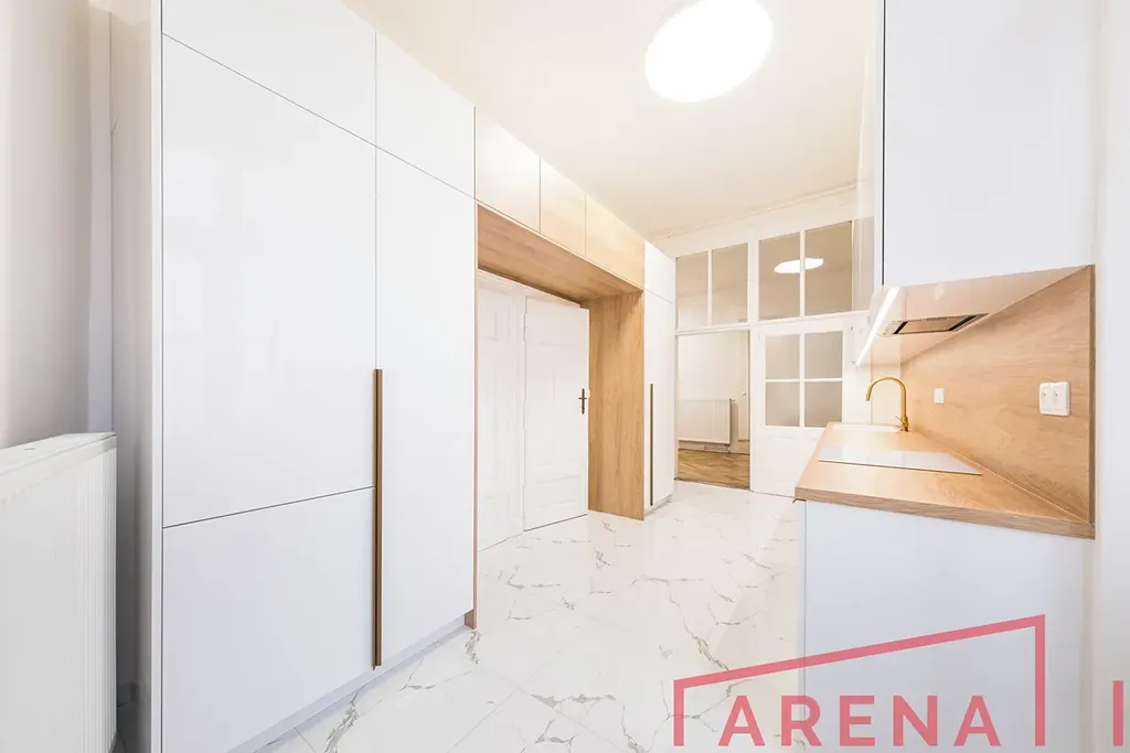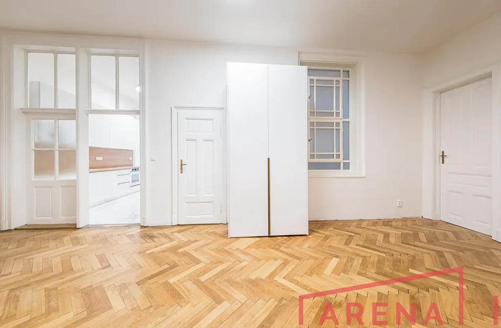 Interiér prošel citlivou renovací – nové parkety podtrhují noblesu vysokých stropů a velkých místností. Byt nabízí čtyři samostatné, nádherně světlé pokoje, které lze využít jako ložnice, pracovnu i reprezentativní obývací prostor.