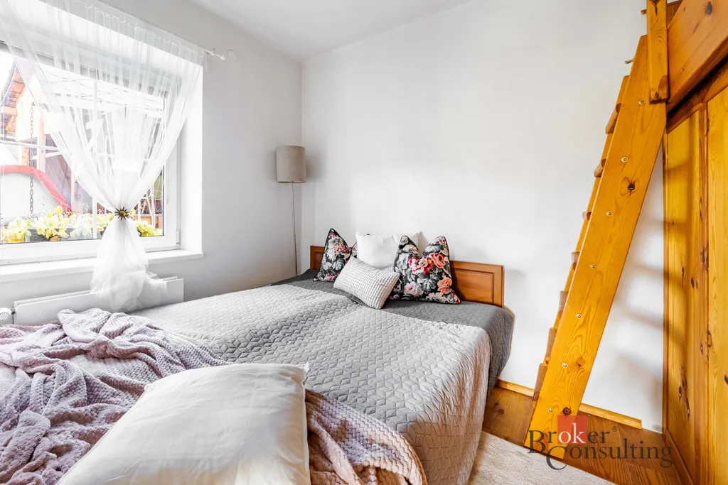 Přízemí (bezbariérové): vstupní hala, sklad, koupelna, samostatné WC, kuchyň s jídelnou, obývací pokoj a ložnice s palandou.