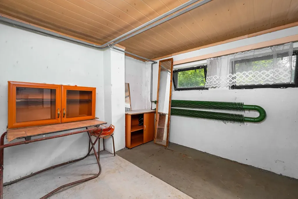 Díky kompletnímu podsklepení je k dispozici garáž, dílna, technické zázemí a úložné prostory.