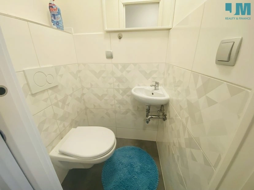 V koupelně je vana se sprchou a zástěnou, umyvadlo se skříňkou, zrcadlo, pračka a bojler. Na toaletě, která je samostatně je umyvadlo se zrcadlem a další velké zrcadlo je i na chodbě, kde jsou věšáky na bundy.