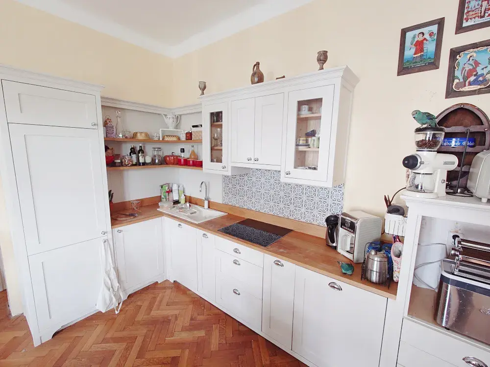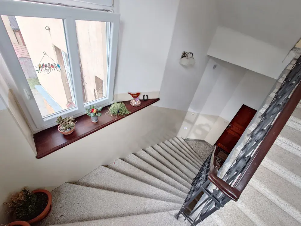 Samotný byt se nachází ve druhém nadzemním podlaží a jeho okna jsou orientována do ulice Husova a Vítězná. Byt prošel také postupnou rekonstrukcí – kuchyně – cca 5 let zpětně – masiv, spotřebiče Siemens a Bosch, elektřina – cca 10 let zpět vč. přípravy na EZS, nový plynový kotel a rozvody tepla, zaveden optický kabel a kabelová TV, výměna oken – kopie původních oken, trojskla, cca 3 roky zpětně, dveře – kompletně zrestaurováno. Vše bylo provedeno s důrazem na zachování původního vzhledu bytu i domu.
