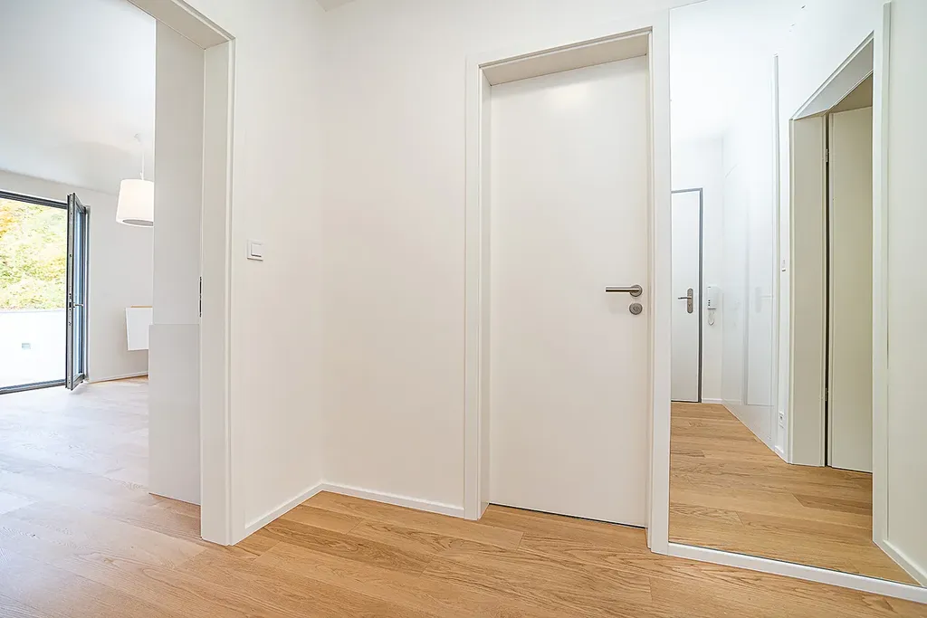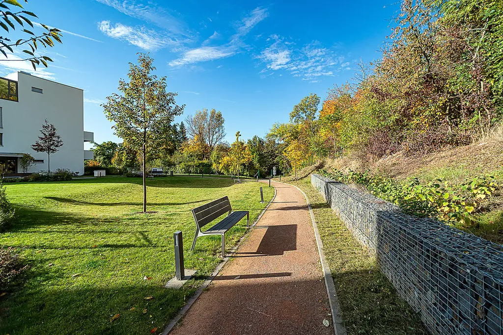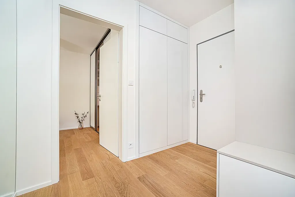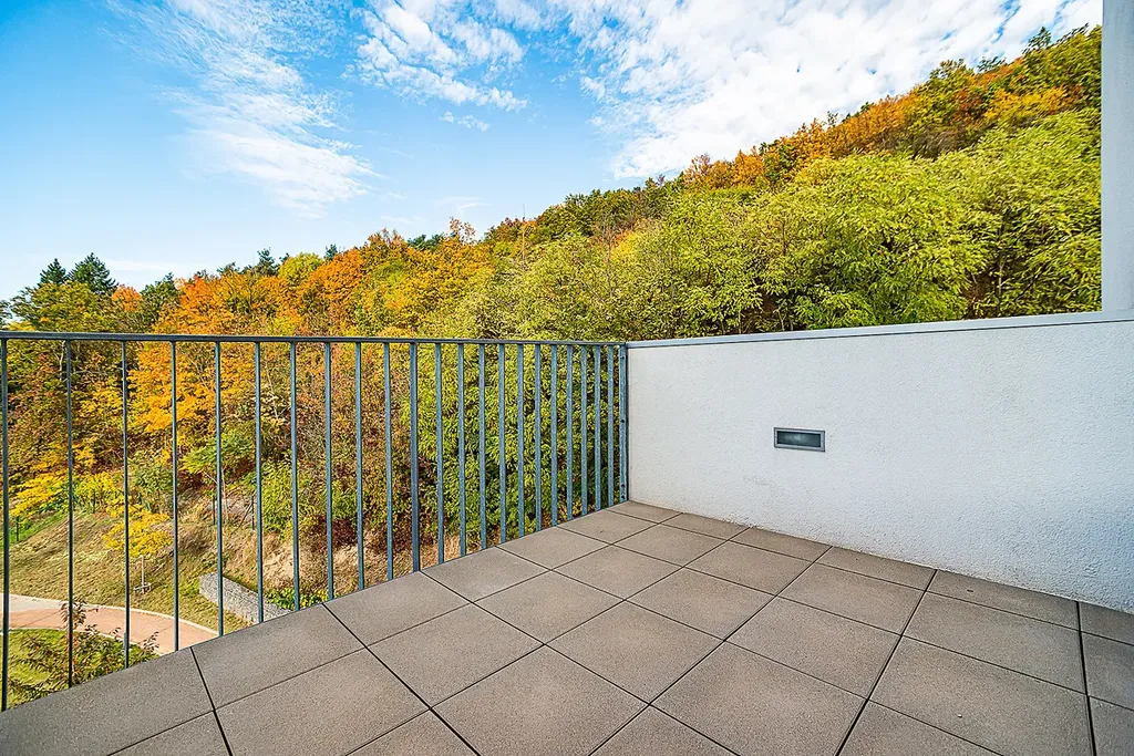 Velkým benefitem bytu je balkon přístupný z obývací části přes francouzské okno, odkud se nabízí jedinečný výhled do zeleně. Balkon je vybaven elektrickou markýzou. V bytě jsou olejované dřevěné podlahy, bezpečnostní vstupní dveře, centrální vytápění a předokenní žaluzie. Vjezd do garáží je plně automatizovaný a celý objekt je zabezpečen kamerovým systémem.
