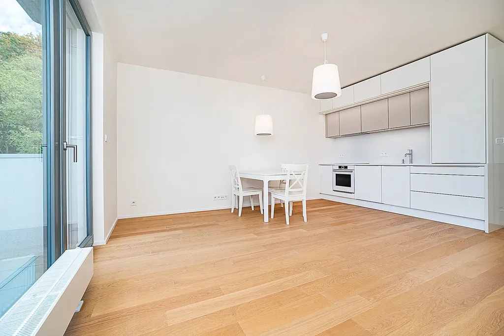 V exkluzivním zastoupení majitele nabízím k pronájmu moderní a světlý byt 2+kk o celkové ploše 54 m² s prostorným balkonem o velikosti 7 m². K bytu náleží dvě parkovací stání v garáži a velký sklep.