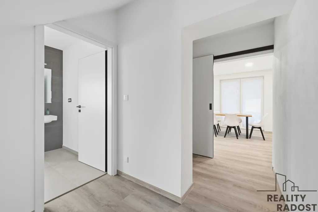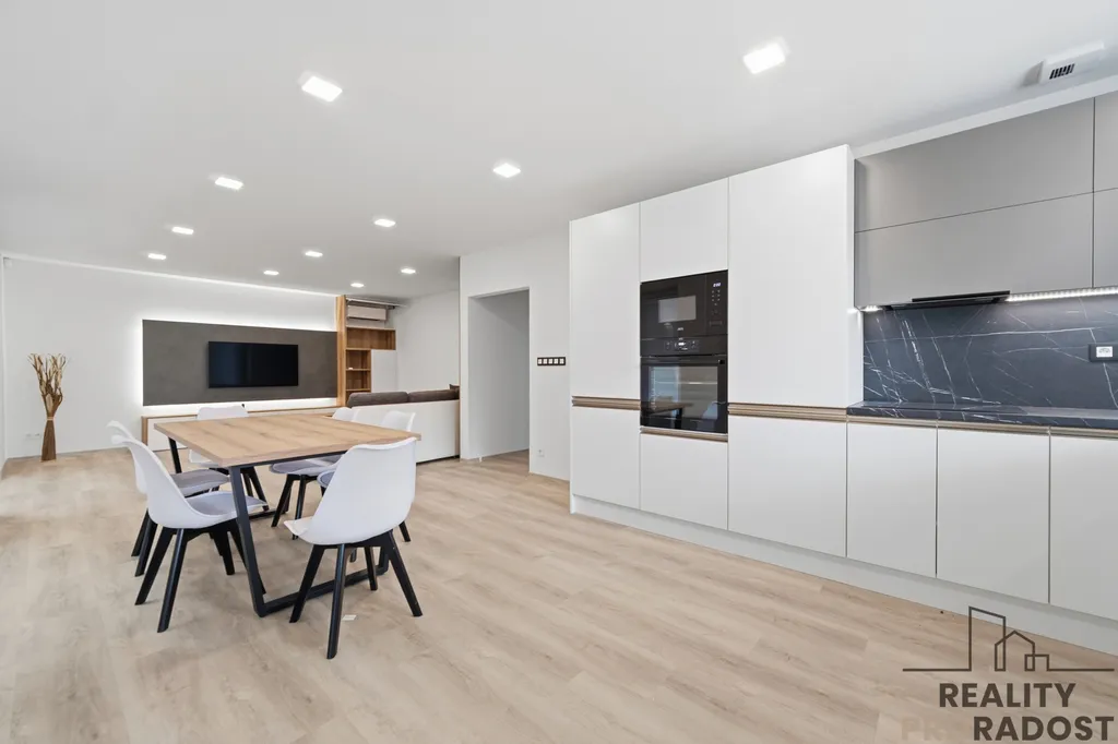 Kuchyň je vybavena novou kuchyňskou linkou včetně jídelního stolu a židlí, lednice, elektrické varné desky, myčky a praktické špajzky.