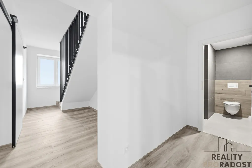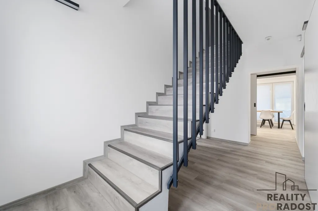 Dominantou prostoru je designové schodiště vedoucí do patra, kde se nachází tři samostatné pokoje (jeden s vlastní šatnou), koupelna s prostorným sprchovým koutem a samostatná toaleta.