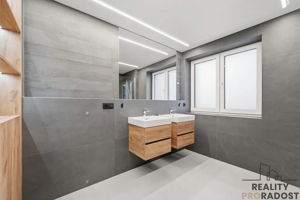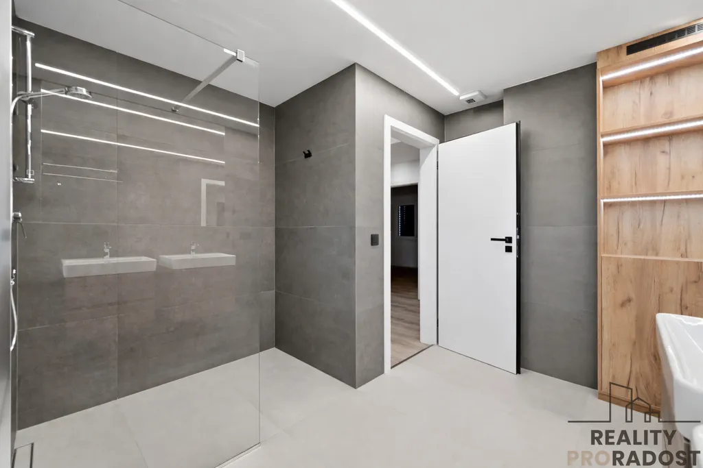 Dispozice je navržena s důrazem na vzdušnost – široké chodby, dostatek úložného prostoru a velkoformátové obklady podtrhují moderní charakter domu.
