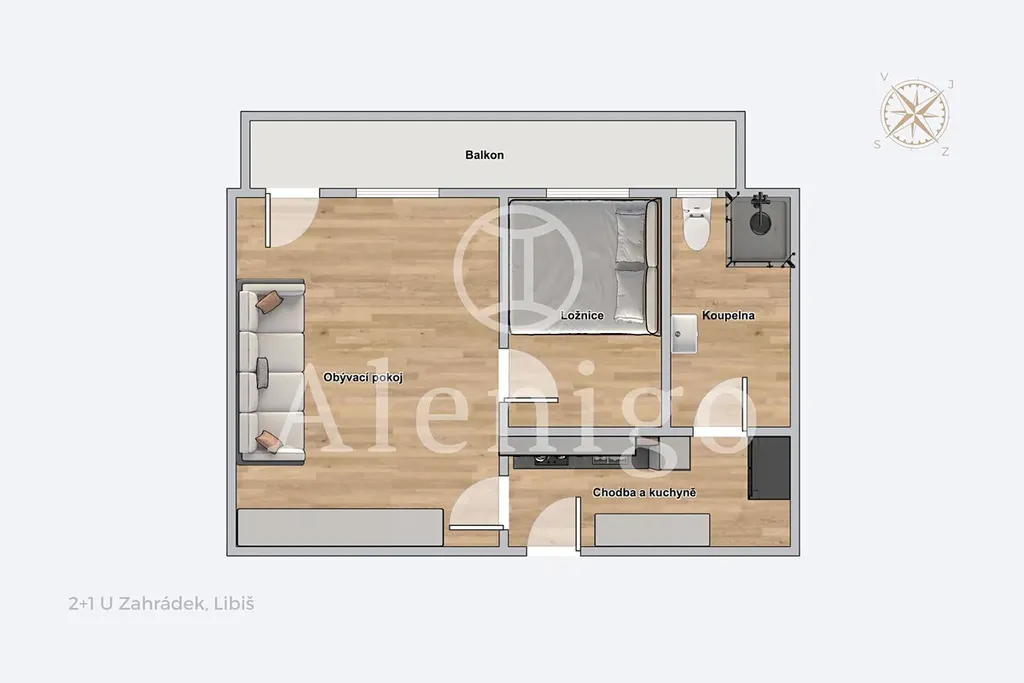 Dispozice: vstupní chodba s kuchyňskou linkou, obývací pokoj s přímým vstupem na balkon, koupelna se sprchovým koutem a WC. K bytu náleží sklepní kóje.