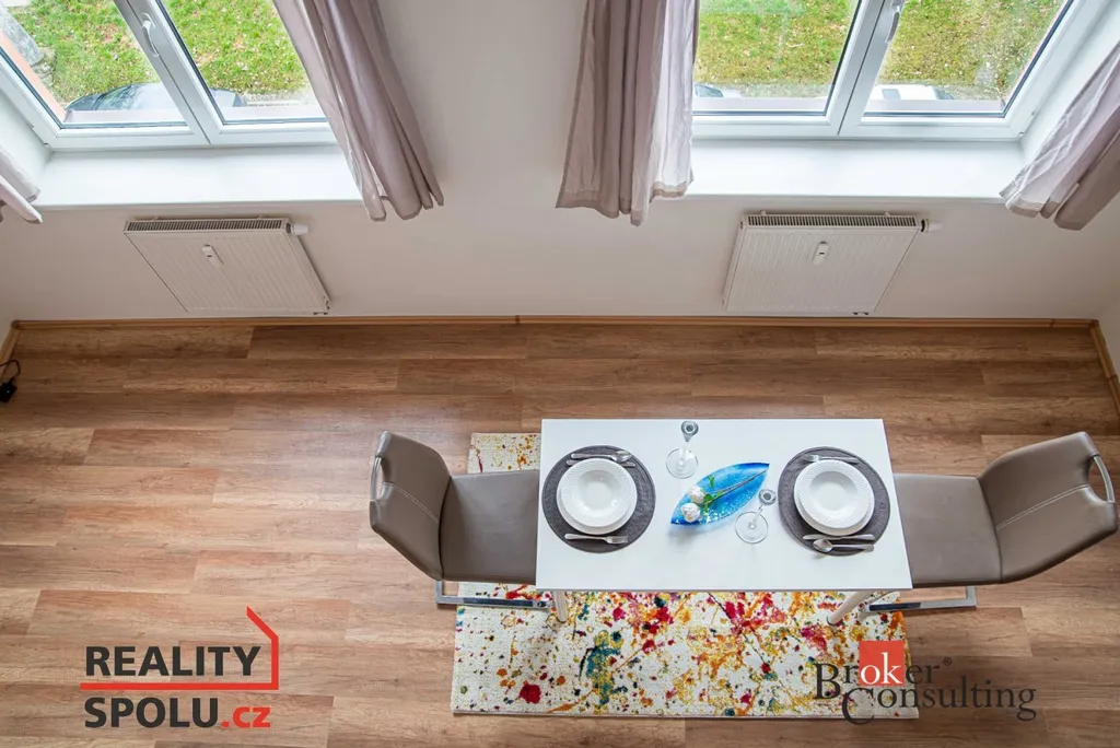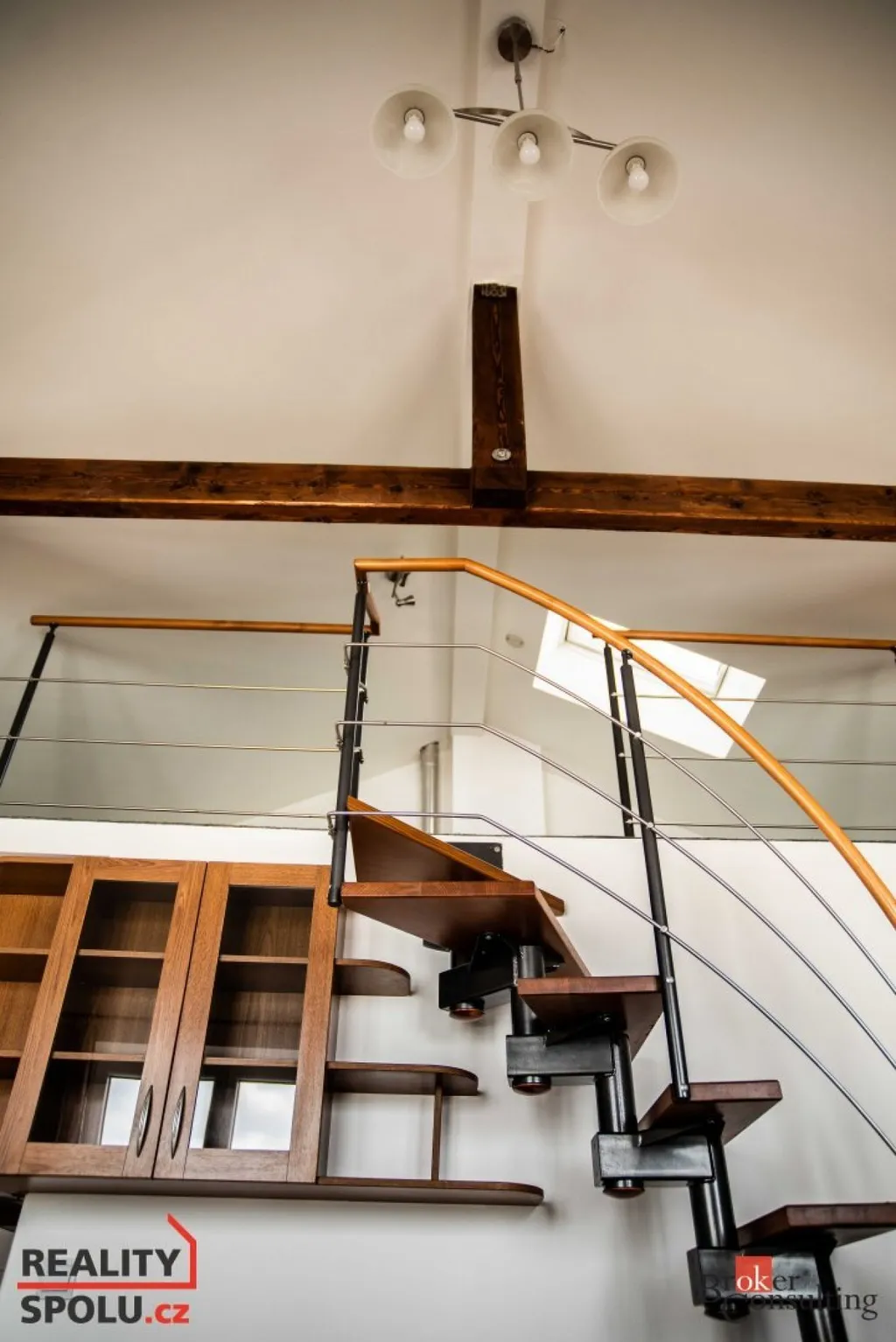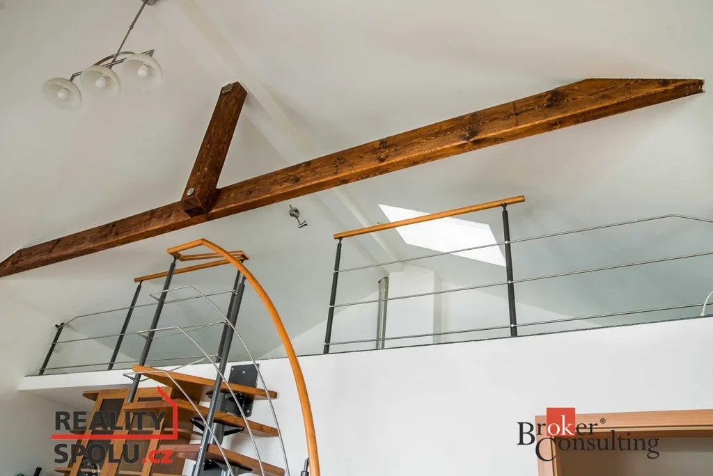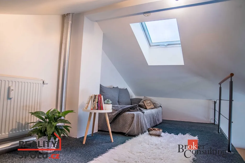 Byt je řešen jako mezonetový a nabízí praktické propojení otevřeného obytného prostoru s kuchyňským koutem, samostatného pokoje, prostorné šatny a patra, které dnes slouží jako ložnice nebo relaxační zóna. Díky tomuto řešení působí byt vzdušně a nabízí více soukromí než klasická dispozice 2+kk.