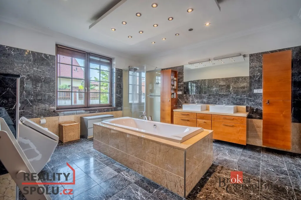 V přízemí vás přivítá prostorný obývací pokoj s krbem, na který volně navazuje jídelna s kuchyní. Celý denní prostor je propojený se zahradou – přes velká francouzská okna vstoupíte přímo na terasu s pergolou. K dispozici je zde také samostatný pokoj, ideální jako ložnice pro hosty, pracovna nebo pokoj pro člena rodiny, který preferuje bydlení bez schodů. Zahrada nabízí soukromí, dostatek místa na odpočinek i zábavu a najdete tu i bazén.