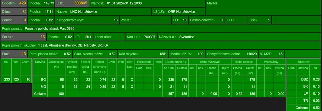 - p.č. 3880 vedená jako lesní pozemek o celkové výměře 5 181 m2, z toho vlastníme podíl 1/2 tedy 2 590 m2 (stáří lesa 127 let - zastoupení dřevin borovice, modřín).