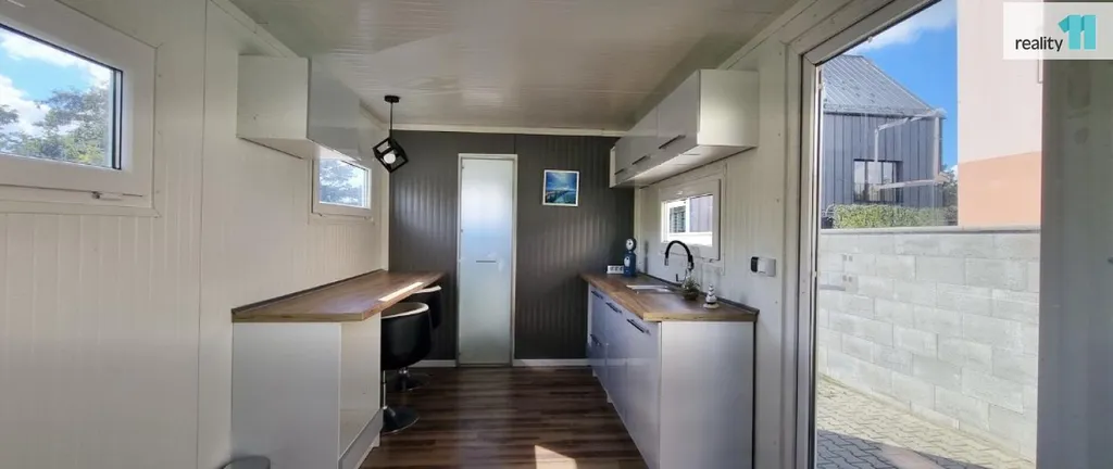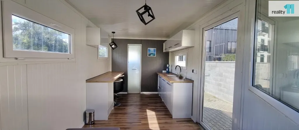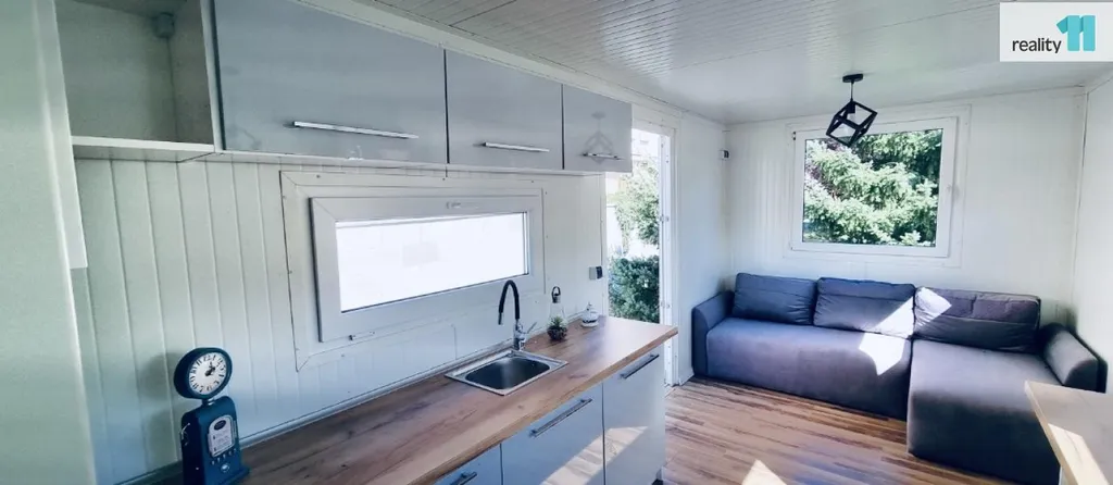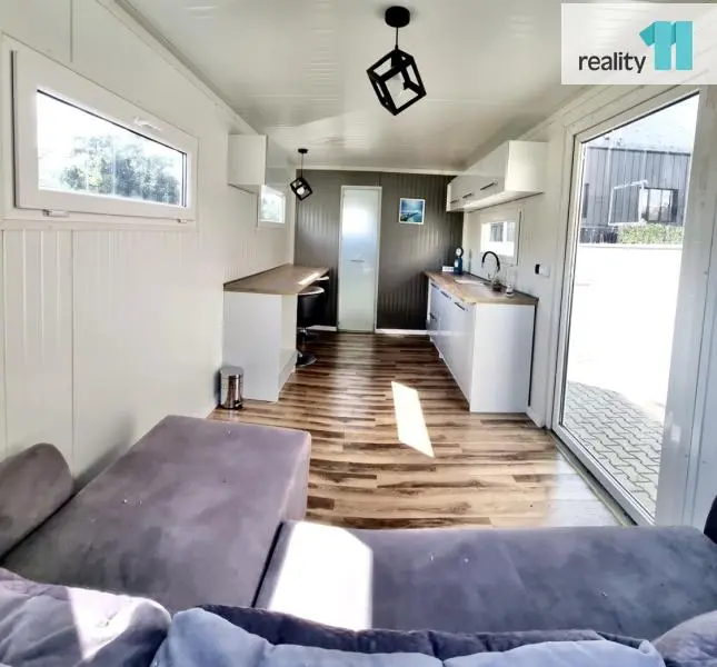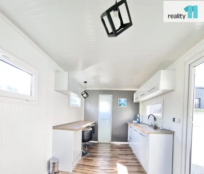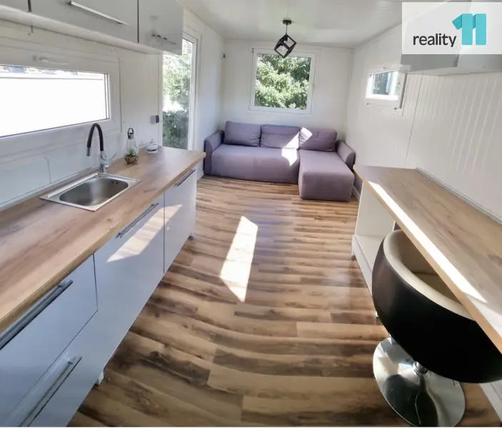 Mobilní domek o velikosti 1kk, 15 m² je plně využitelný a vhodný jak k rekreaci, tak i díky zateplení k celoročnímu užívání.