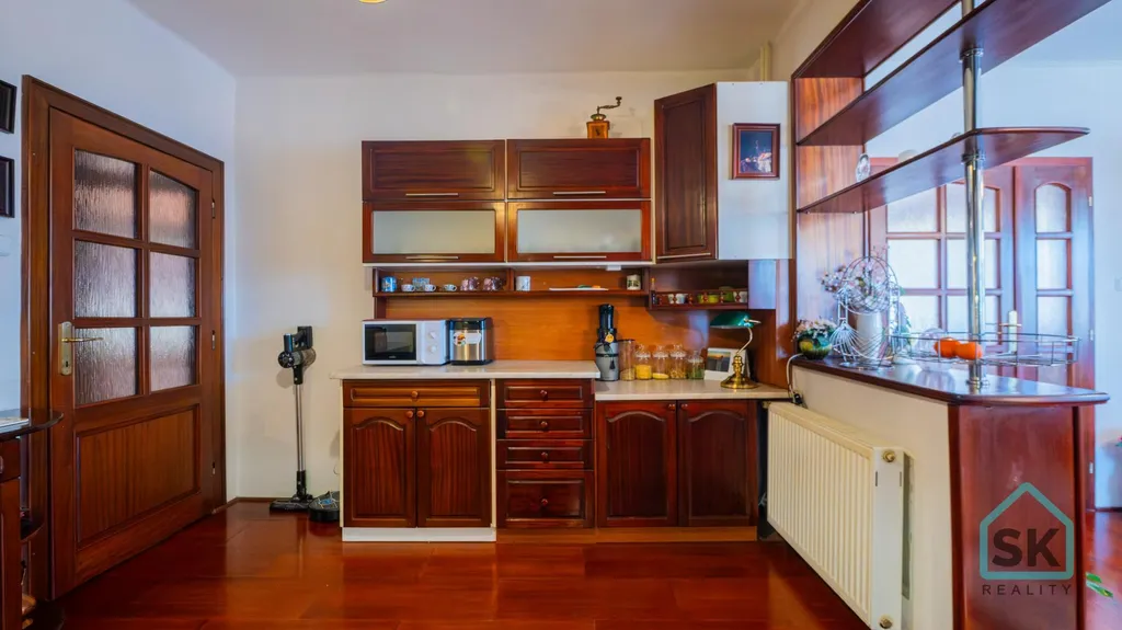 Prodej rodinného domu vč. částečného vybavení v Krnově na ulici Boční. V přízemí domu je zasklený balkon, vstupní obytná chodba, obývací pokoj s jídelnou a vstupem do zimní zahrady, kuchyně, další dva samostatné pokoje, koupelna s vanou a toaletou. Dům má dva vchody, druhým vstupem ze zahrady je vstupní chodba, po schodech nahoru v mezipatře je malý pokoj, v patře potom byt 2+1, kde je zasklený rohový balkon, koupelna se sprchou a toaletou. Dům je celopodsklepen, v těchto prostorách je kotelna (kotel na tuhá paliva, bojler na ohřev vody, plynový kotel), prádelna, toaleta, letní kuchyně, komora, velká dílná. V suterénu je dále garáž, pro 2 auta, vjezd z hlavní cesty. Voda čerpána z řádu (na zahradě i studna s užitkovou vodou), vytápění ústřední na tuhá paliva, plynové a v jídelně lokální krb. Střecha pultová, vloni částečně nová hydroizolace, krytina IPA. V domě jsou krásné dřevěné podlahy, dveře a schodiště, plastová okna. Hlavní rekonstrukce domu proběhla v r. 2001, přístavba domu byla v r. 2005. Dům je zateplen polystyrenem. Na zahradě je skleník, pergola, altán, bazén. Dum nebyl nikdy zasazen povodní, nachází se mimo záplavovou oblast. Dům nabízí klidné bydlení s dobrou dostupností do centra, do obchodu, školy atd. Financování zajistíme.