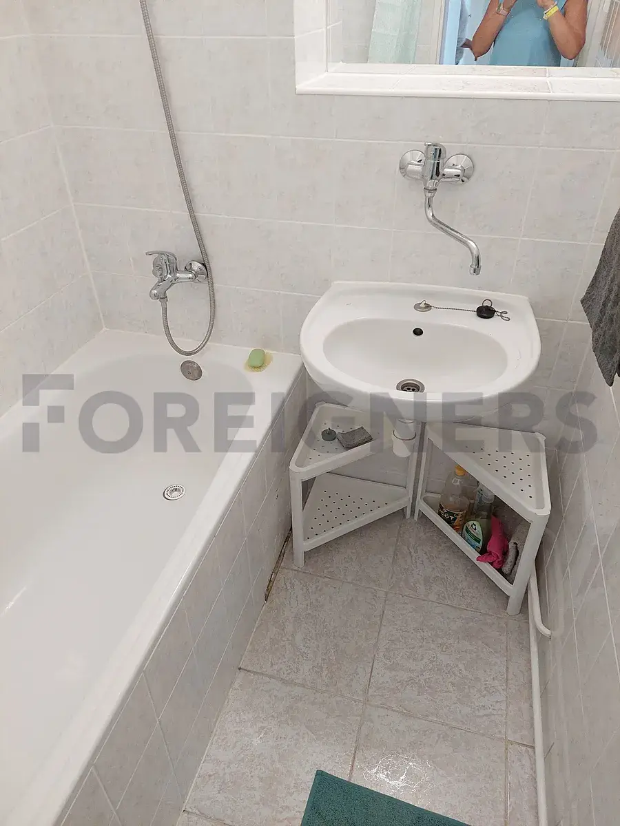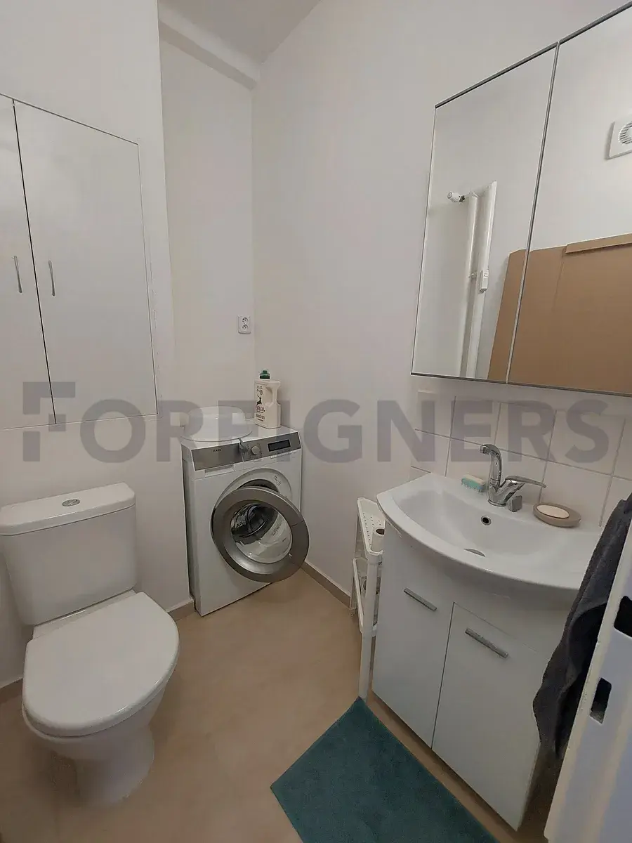 Byt sestává ze vstupní chodby s vestavěnou skříní. Koupelna s vanou, umyvadlem a zrcadlem. Samostatné WC s pračkou, umyvadlem a zrcadlem. Kuchyň s kuchyňskou linkou s plynovým sporákem, elektrickou troubou, lednicí s mrazákem, digestoří, rychlovarnou konvicí, toustovačem, dřezem a jídelním stolem se 4 židlemi.