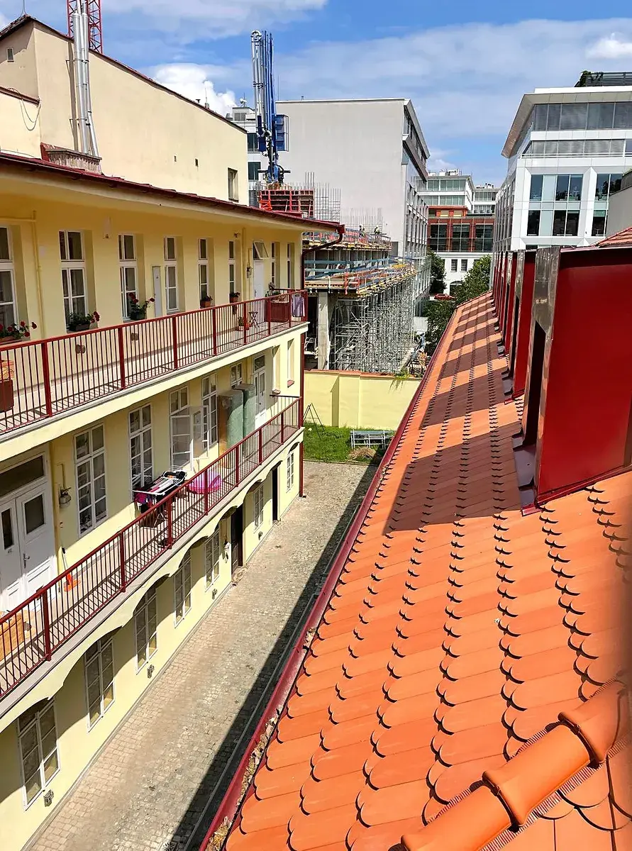 Unikátní příležitost – skvělý mezonetový byt 2+kk přímo na Karlínském náměstí! V Kollárově ulici, která je součástí Karlínského náměstí, se ve 3. a 4. patře klidného pavlačového domu po citlivé rekonstrukci s vlastním upraveným dvorkem nachází atypický půdní mezonet dispozice 2+kk o podlahové ploše cca 67 m2. Jedná se o půdní vestavbu z roku 2023, vše je tedy téměř nové. Byt rozdělen na spodní/denní část a horní/ložnicovou část. Ve spodním patře se nachází předsíň s přístupem do koupelny s WC a do obývacího pokoje s kuch. koutem, jídelnou se schodištěm do horní části, v horním patře je pak ložnice rozdělena na spací kout a pracovnu/šatnu/úložný prostor. Z bytu výhledy na platany na náměstí, park a boční stranu kostela sv. Cyrila a Metoděje (4 střešní okna v obývacím pokoji) a přes domovní dvůr a střechy sousedních domů na nové Corso Karlín, na stromy a památník na Vítkově (1 střešní okno v horním patře).