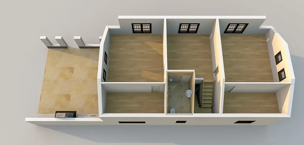 V 2. nadzemním podlaží se nachází 3x pokoj, koupelna a schodiště, podlahová plocha 113,36 m2.