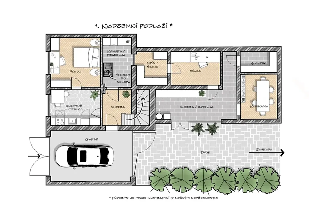 Z dvorku je přístup do skladových prostor a dílny, které oceníte pro hobby i technické zázemí. Tyto nebytové prostory lze propojit s hlavní obytnou částí domu a vytvořit tak rozsáhlý obytný prostor s přímým vstupem a výhledem do zahrady.