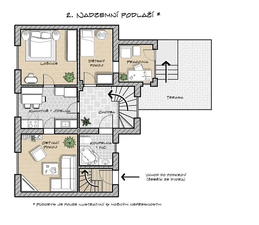 Horní patro o dispozici 3+1 je aktuálně obývané a umožňuje okamžité nastěhování. Obytná část je příjemně světlá a plynule navazuje na prostornou terasu o velikosti přibližně 24 m² orientovanou do klidné zahrady – ideální místo pro ranní kávu, odpočinek i rodinné posezení.