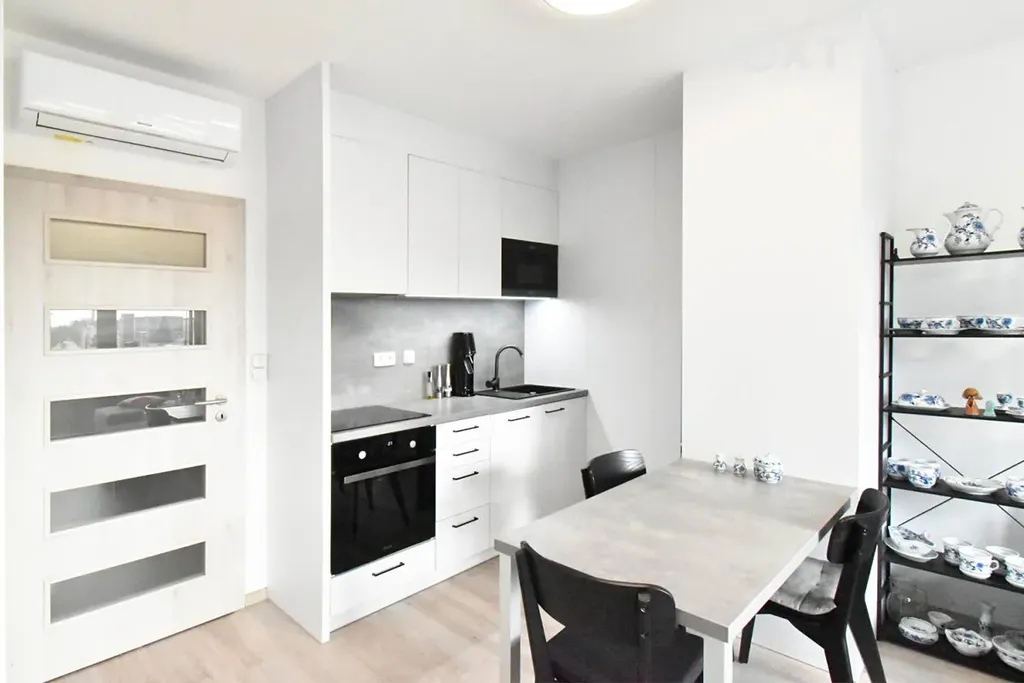 V obývací části bytu je sedací souprava se dvěma taburety, konferenčním stolkem, policemi a televizí, součástí kuchyňského koutu je jídelní stůl s židlemi kuchyňská linka s nádobím a veškeré instalované elektrospotřebiče značky Whirpool: lednice s mrazákem, pečící trouba, mikrovlnná trouba, indukční varná deska, myčka, a digestoř. V ložnici najdete velké dvoulůžko „boxspring“, komodu, noční stolky a velkou šatní skříň s policemi a pořadačem.