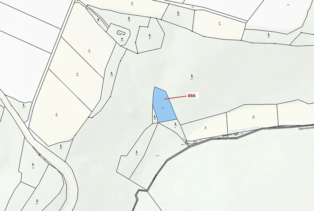 Ostatní plocha o výměře 1277 m2, parcelní číslo 866, podíl 1/1, katastrální území Malý Dešov, obec Dešov, obec s rozšířenou působností Moravské Budějovice, okres Třebíč, Kraj Vysočina.