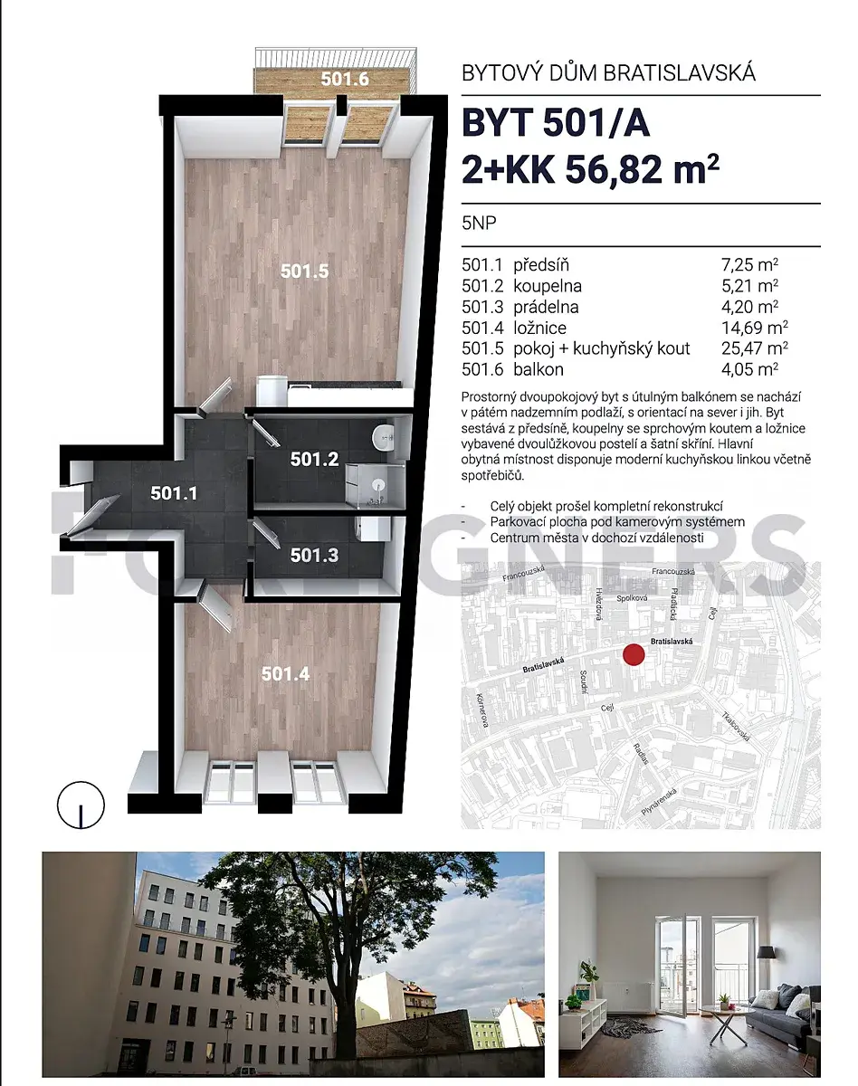 Nabízíme příjemný a útulný byt č. 501a o dispozici 2+kk s balkonem, který se nachází v oblíbené brněnské čtvrti Zábrdovice, nedaleko centra města. Byt je ideální pro jednotlivce nebo pár, kteří hledají pohodlné bydlení s výbornou dostupností do centra i dalších částí Brna.