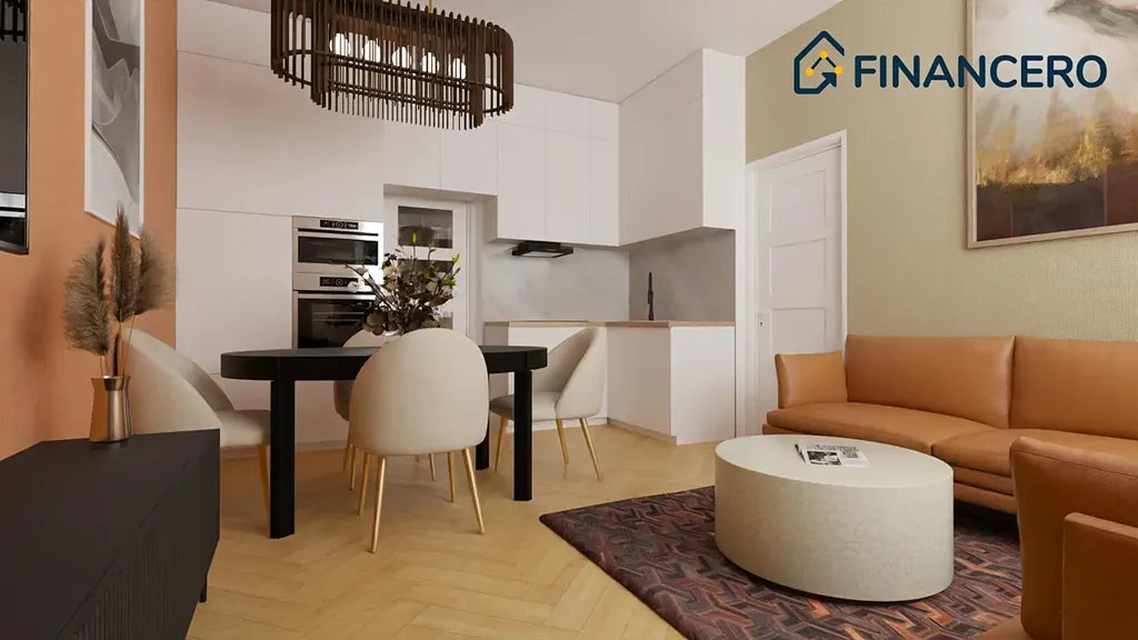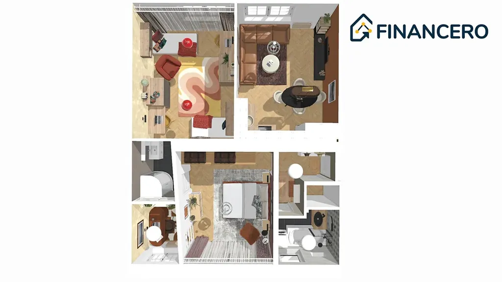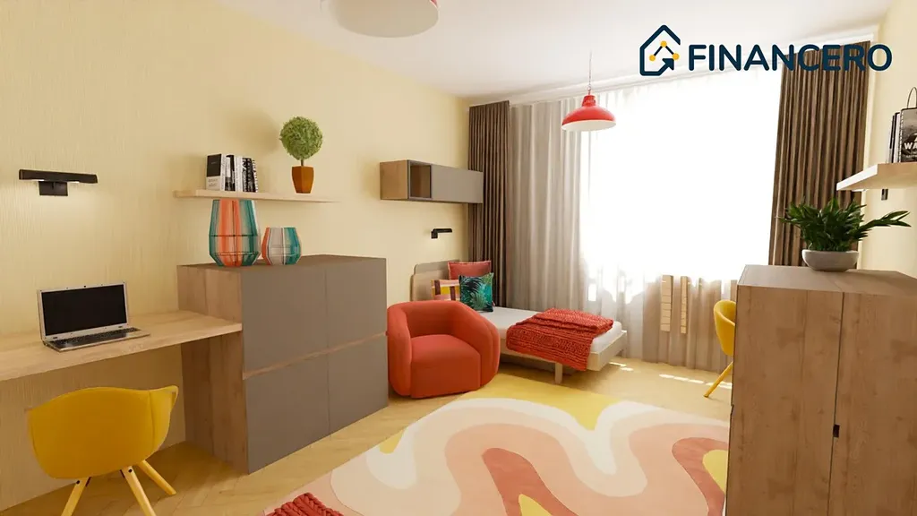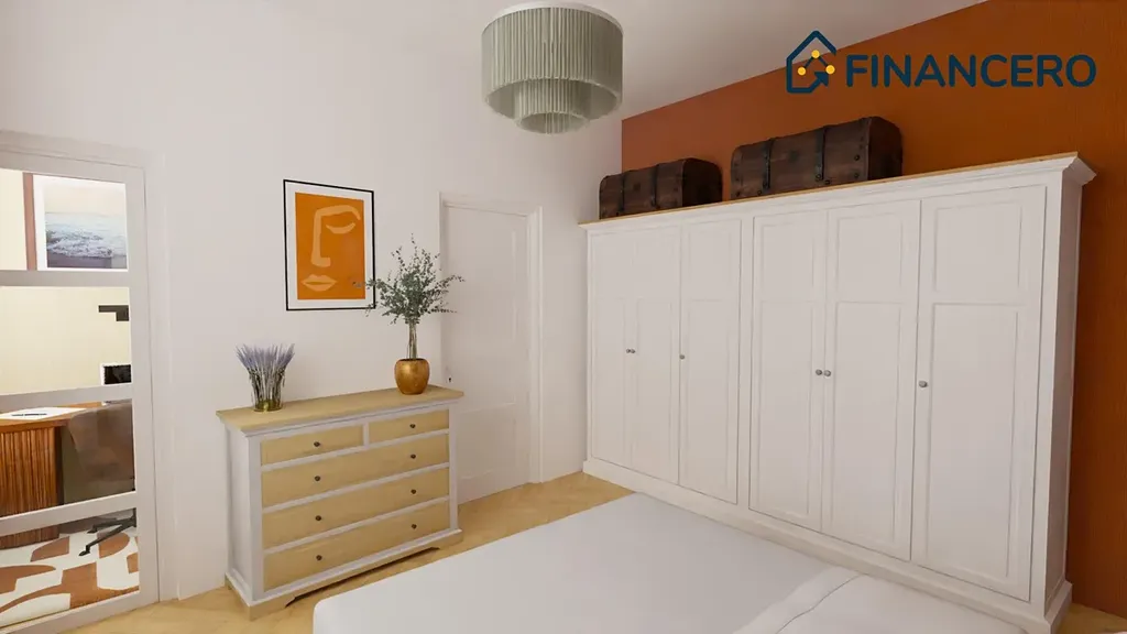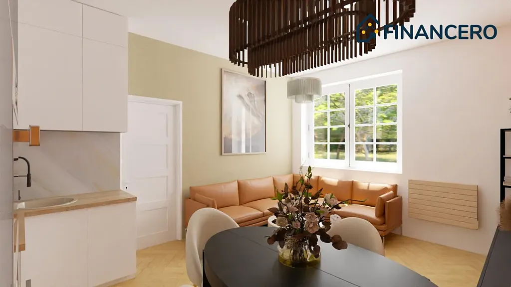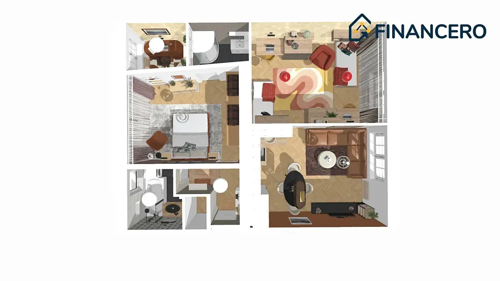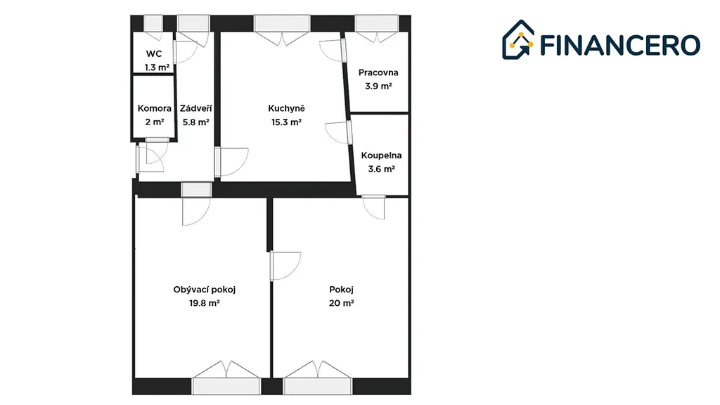 Aktuální dispozice bytu nabízí dva velmi prostorné pokoje o výměrách 19,8 a 20 m2, kde v levém pokoji je poměrně snadné vybudovat kuchyňskou linku a současnou kuchyni tak přetvořit na ložnici orientovanou do vnitrobloku. K ložnici by pak náležela pracovna či šatna o výměře 3,9 m2.