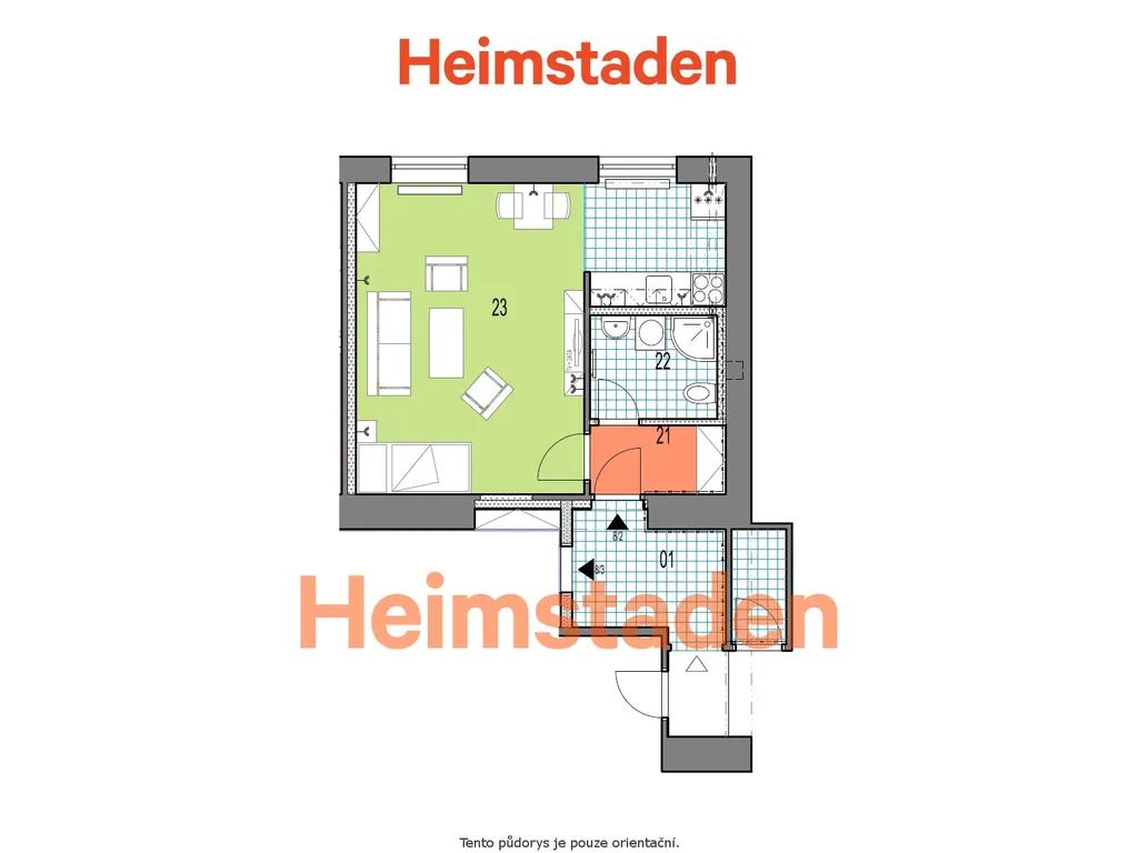 Hlavní obytný prostor je na svou dispozici poměrně příjemný a nabízí dostatek místa pro pohodlné bydlení i zařízení dle vlastních představ. Kuchyňský kout je chytře schovaný za rohem, takže neruší celkový dojem z pokoje, a přitom poskytuje plnohodnotné zázemí s klasickou kuchyňskou linkou a sporákem.
