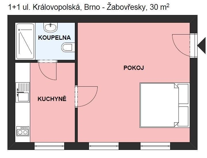 Ve výhradním zastoupení majitele nabízíme k pronájmu byt 1+1 v Brně - Žabovřeskách na ulici Královopolská. Byt se nachází v přízemí cihlového domu. Celková plocha bytu je 30 m2.