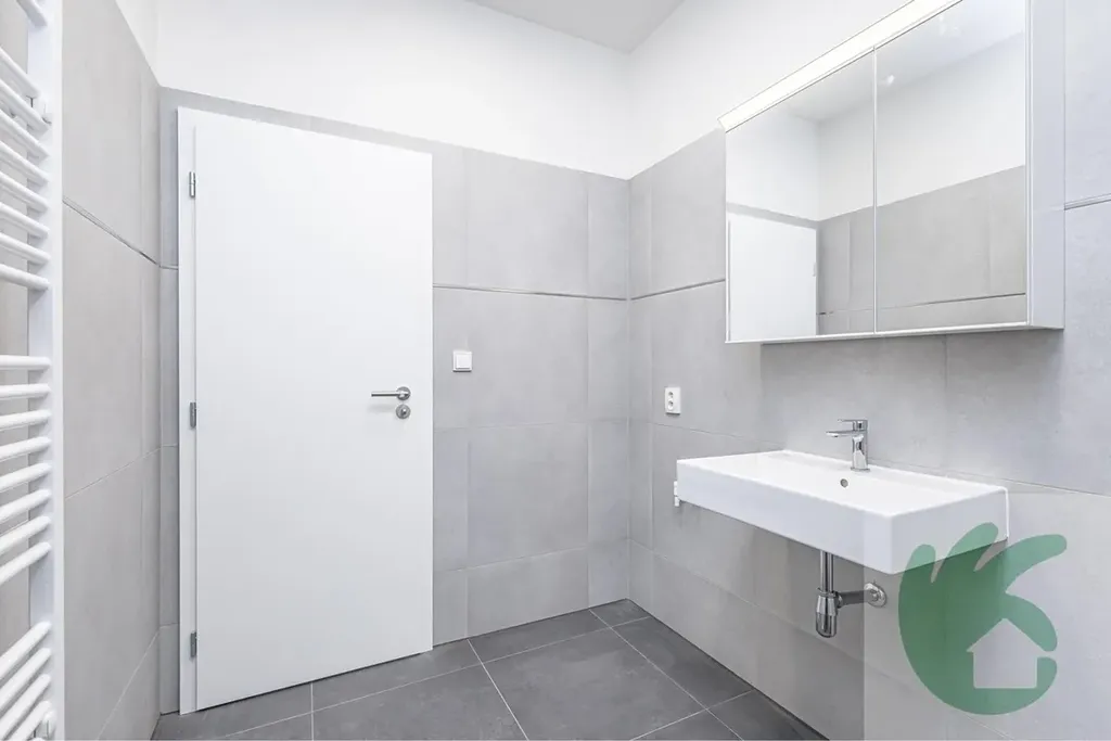 Po vstupu do bytu se ocitneme v prostorné chodbě s praktickou skříní pro uložení věcí. Z chodby vstoupíme do moderní koupelny, která nabízí prostorný sprchový kout, umyvadlo se skříňkou a zrcadlem, toaletu i žebříkové topení pro příjemný komfort.
