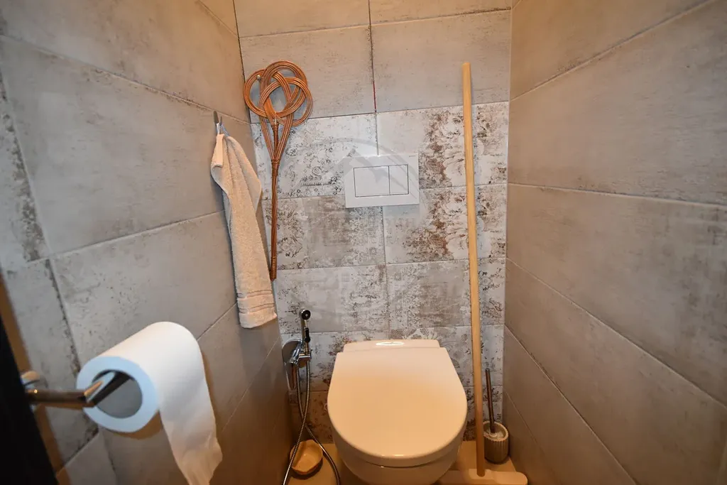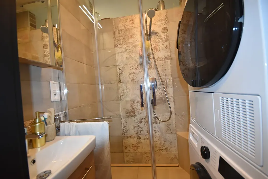 • Koupelna: Moderní sprchový kout s rohovým posezením, pračka a sušička jsou součástí prodeje, WC s bidetovou sprchou
