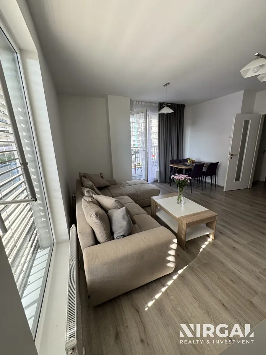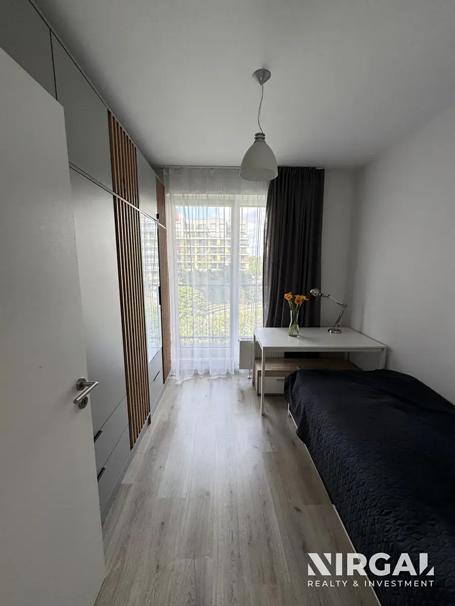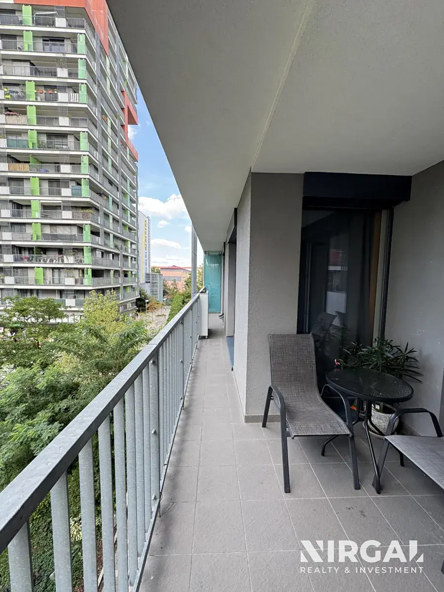 Byt se nachází ve 3. patře a tvoří ho 3 neprůchozí místnosti: světlý obývací pokoj s kuchyňským koutem a 2 útulné ložnice. Všechny pokoje mají velká francouzská okna a vstup na terasu (21 m2). Prostorná koupelna s vanou má dostatek místa i na skříňky a pračkou. Toaleta je samostatná, s vlastním umyvadlem. Kuchyňská linka je vybavená ledničkou s mrazákem, sklokeramickou varnou deskou, mikrovlnnou troubou, digestoří, troubou a myčkou. Okna bytu jsou orientovaná do tichého dvora. V bytě jsou bezpečnostní dveře. K bytu náleží sklep (3 m2).