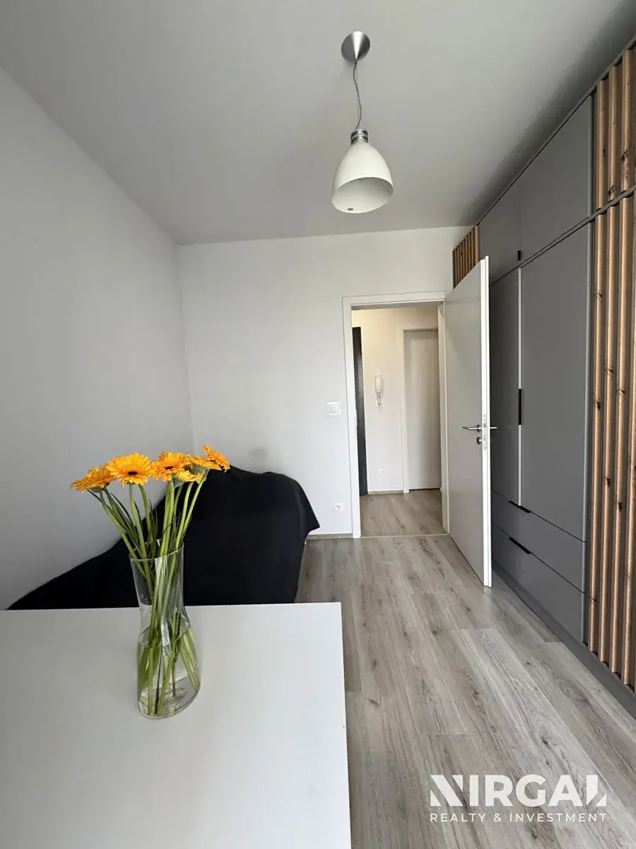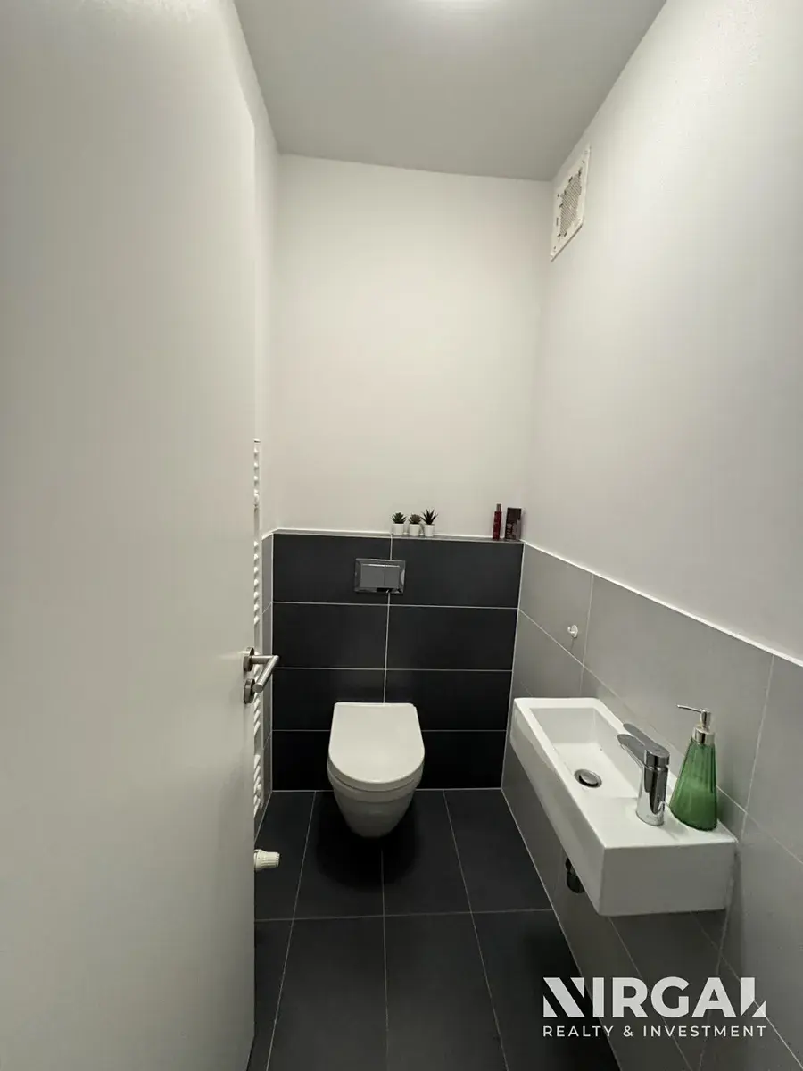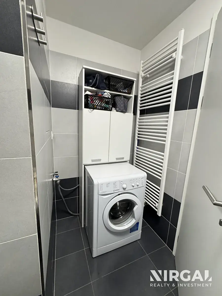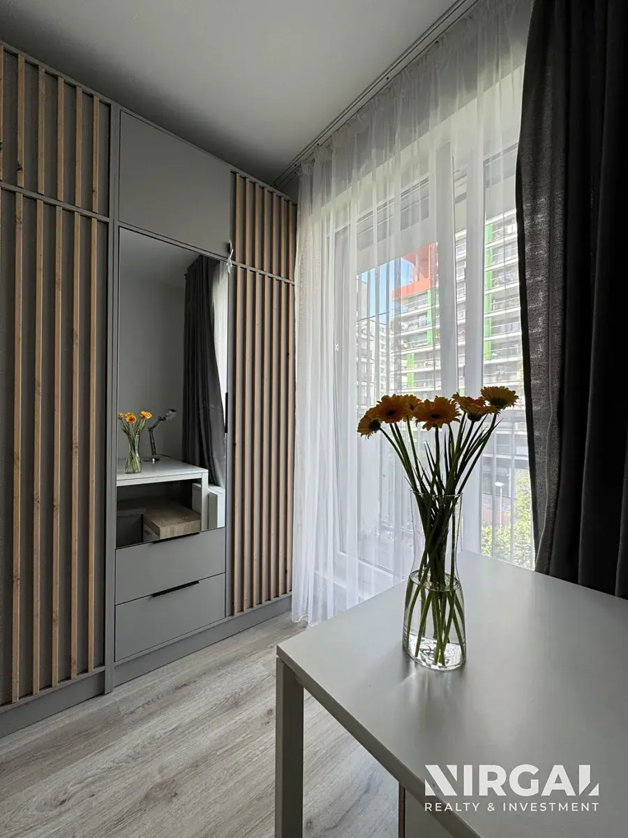 Byt se nachází ve 3. patře a tvoří ho 3 neprůchozí místnosti: světlý obývací pokoj s kuchyňským koutem a 2 útulné ložnice. Všechny pokoje mají velká francouzská okna a vstup na terasu (21 m2). Prostorná koupelna s vanou má dostatek místa i na skříňky a pračkou. Toaleta je samostatná, s vlastním umyvadlem. Kuchyňská linka je vybavená ledničkou s mrazákem, sklokeramickou varnou deskou, mikrovlnnou troubou, digestoří, troubou a myčkou. Okna bytu jsou orientovaná do tichého dvora. V bytě jsou bezpečnostní dveře. K bytu náleží sklep (3 m2).