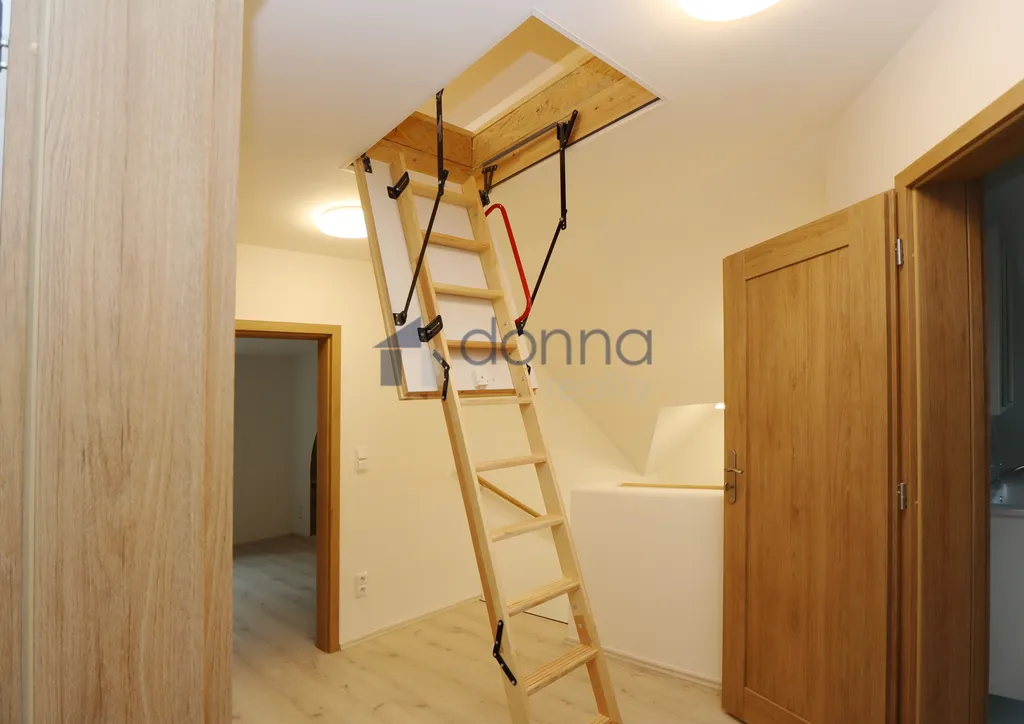 Vstupní hala, světlý obývací pokoj s kuchyňským koutem a krásným klenutým stropem, neprůchozí ložnice, další průchozí pokoj + menší pracovna či dětský pokoj, koupelna se sprchovým koutem a přípravou na pračku, samostatné WC a praktický podkrovní úložný prostor o ploše 23m².