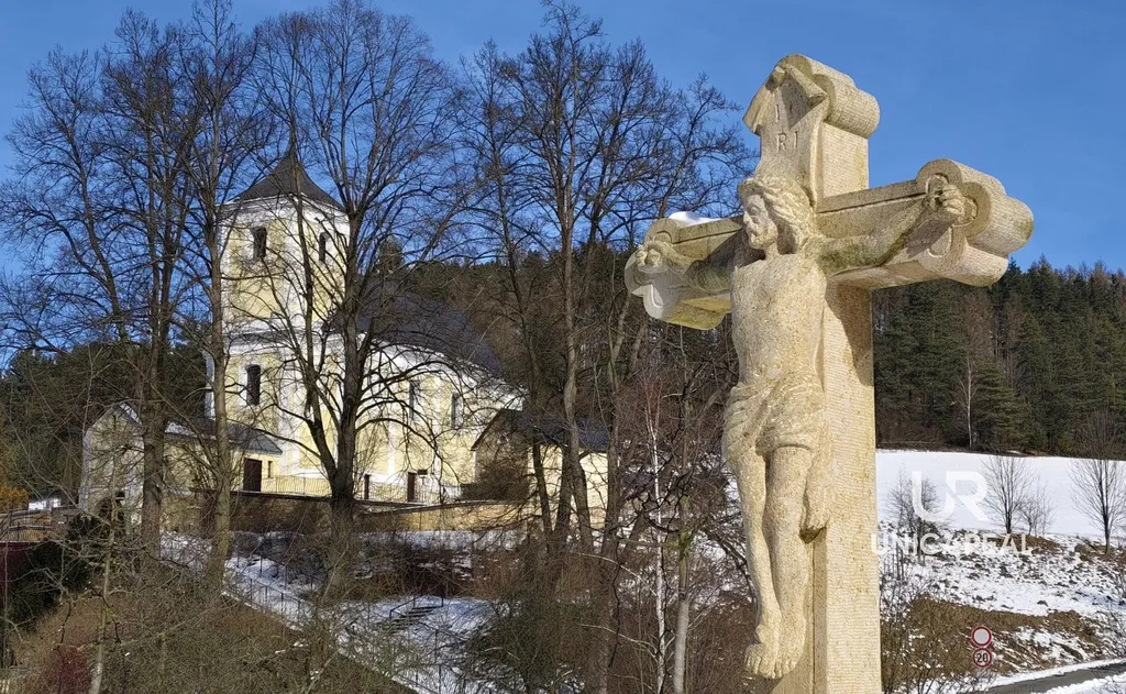 Z pozemku je nádherný výhled na barokní farní kostel sv. Mikuláše z roku 1759