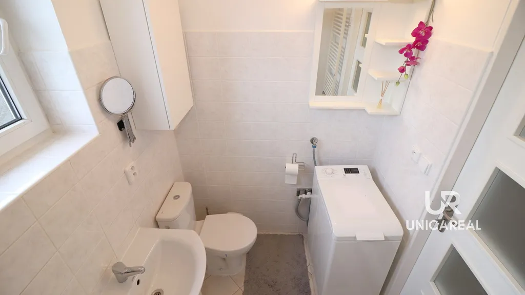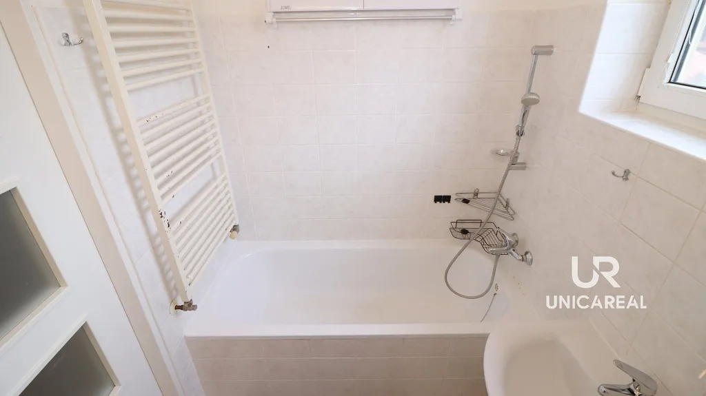 Koupelna s vanou, umyvadlem , topným žebříkem, toaletou vč. prostoru pro pračku.