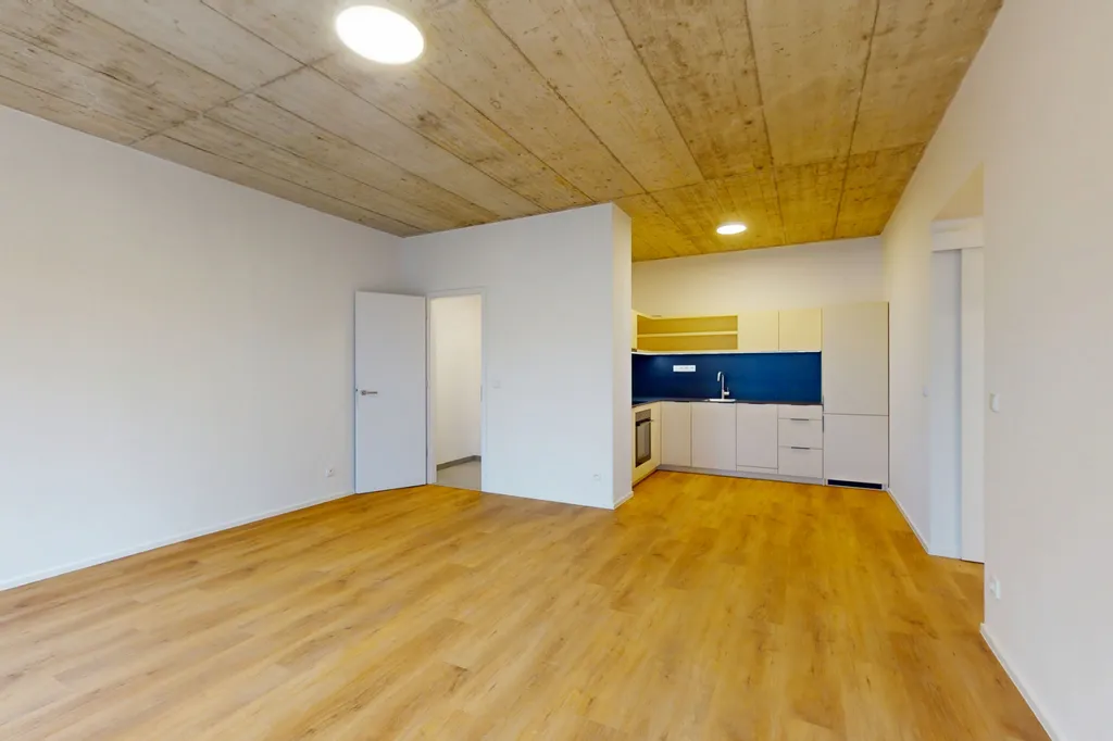 Byty prošly kompletní rekonstrukcí a působí mimořádně moderně a vzdušně. Dominantním architektonickým prvkem je pohledový betonový strop, který prostoru dodává jedinečný charakter a lehce industriální nádech.