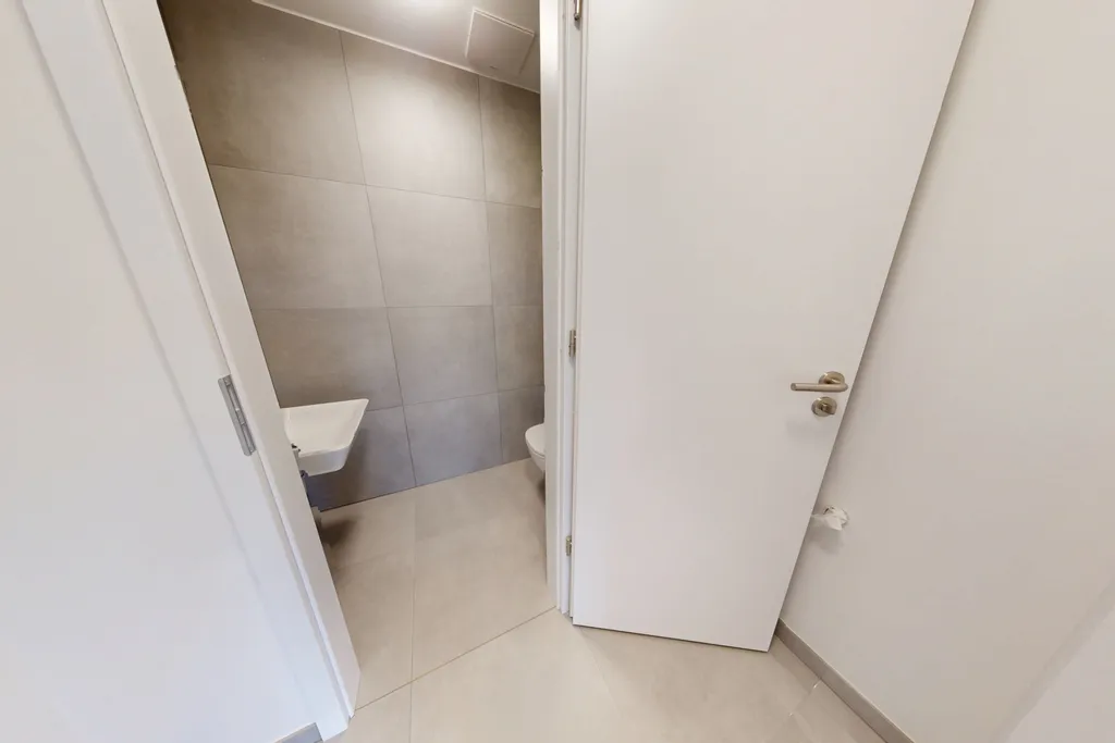 Prostorná koupelna nabízí vanu, samostatný sprchový kout, umyvadlovou skříňku se zrcadlem a toaletu. Velkým benefitem je také technická místnost připravená pro pračku a samostatná oddělená toaleta, která zvyšuje komfort každodenního bydlení.