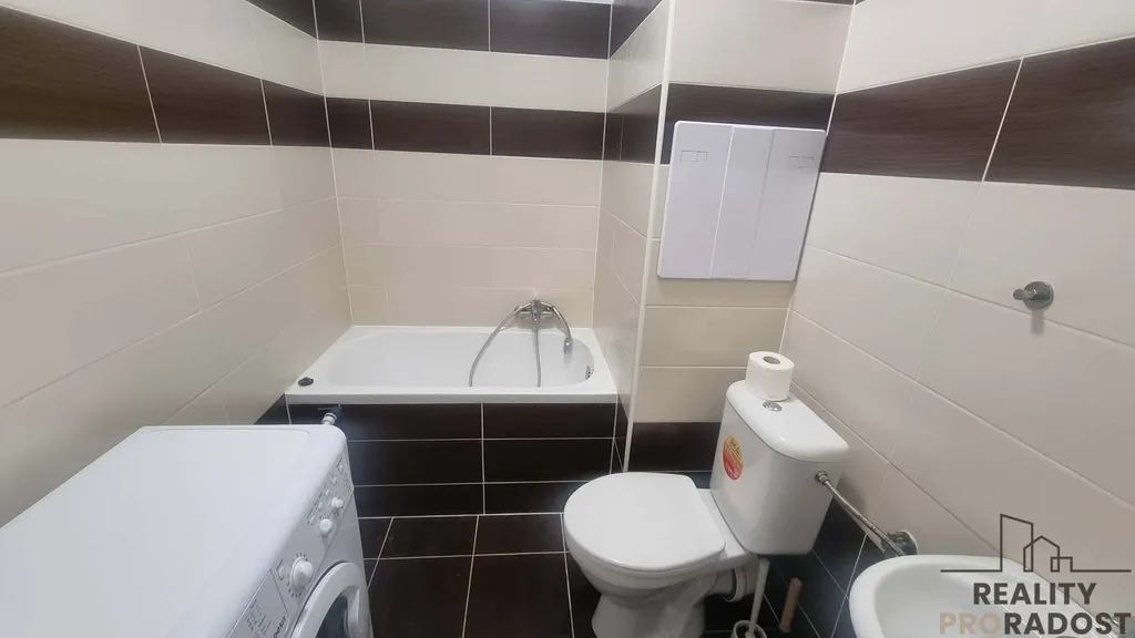 Koupelna disponuje sprchovým koutem, koupelnovou skříňkou a prostorem pro pračku. K bytu náleží také sklepní kóje.