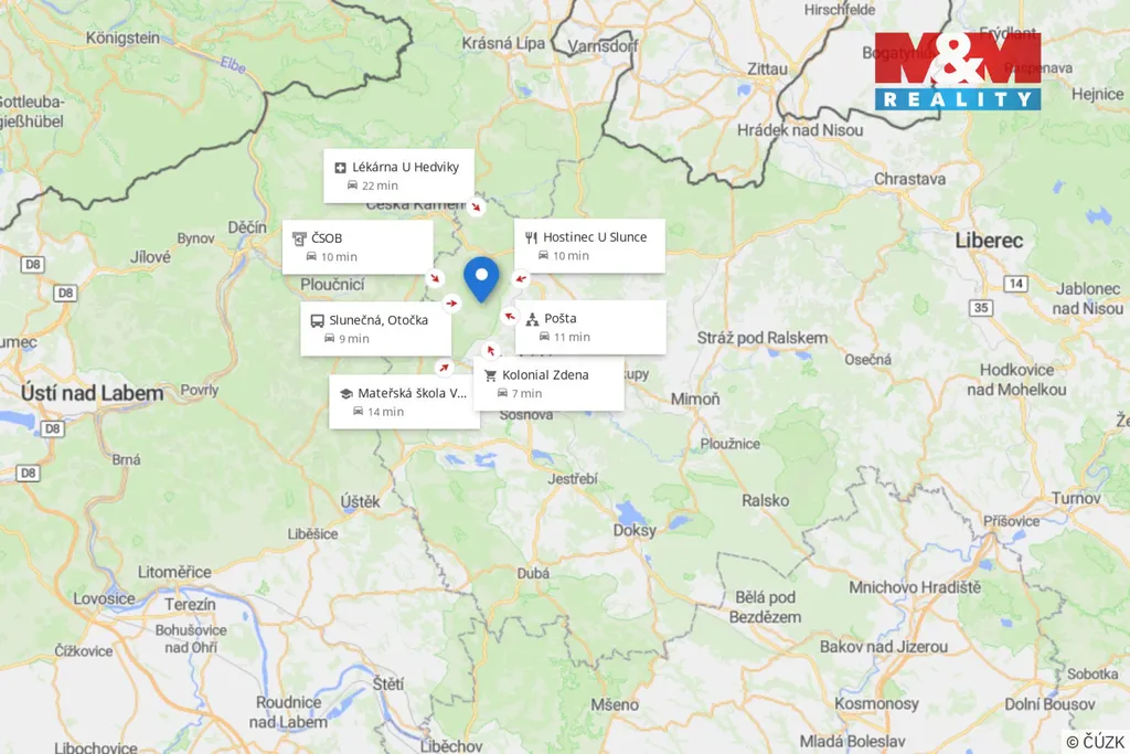 Prodej rodinného domu 5+kk v klidné části obce Slunečná, 9 km od České Lípy. Dispozice domu se rozkládá ve dvou nadzemních podlaží a nedílnou součástí je celkově oplocená okrasná zahrada, navržená architektem, s výměrou 1689 m². Dům je velmi prostorný. Obývací pokoj s kuchyní, hala, chodba, koupelna (sprch. kout + vana), samostatné WC, prádelna, technická místnost, tvoří první nadzemní podlaží. V druhém nadzemním podlaží jsou 3 pokoje, koupelna se sprchovým koutem a bidetem, pracovna a vstup na pochozí půdu. Vytápění a ohřev vody tepelným čerpadlem (podlahové topení + radiátory), další zdroj doplňují solární panely s baterií o výkonu 10 kWh. To vše tvoří nízké provozní náklady. Zahrada se může pochlubit vjezdem s elektrobránou na dálkové ovládání, krytým stáním na dvě auta s elektronabíjecí stanicí, finskou saunou, zahradním domkem, krytou terasou se vstupem přímo z domu, pergolou, bazénem a skleníkem. Dům je vybaven venkovními roletami a krásným výhledem do krajiny. Více info v RK.