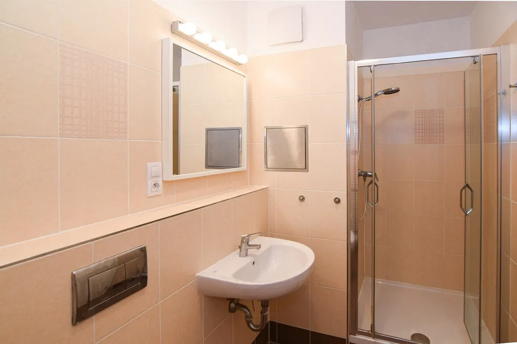 Koupelna je prostorná a je společná s toaletou. Koupelna disponuje sprchovým koutem a dostatkem prostoru na pračku a sušičku.